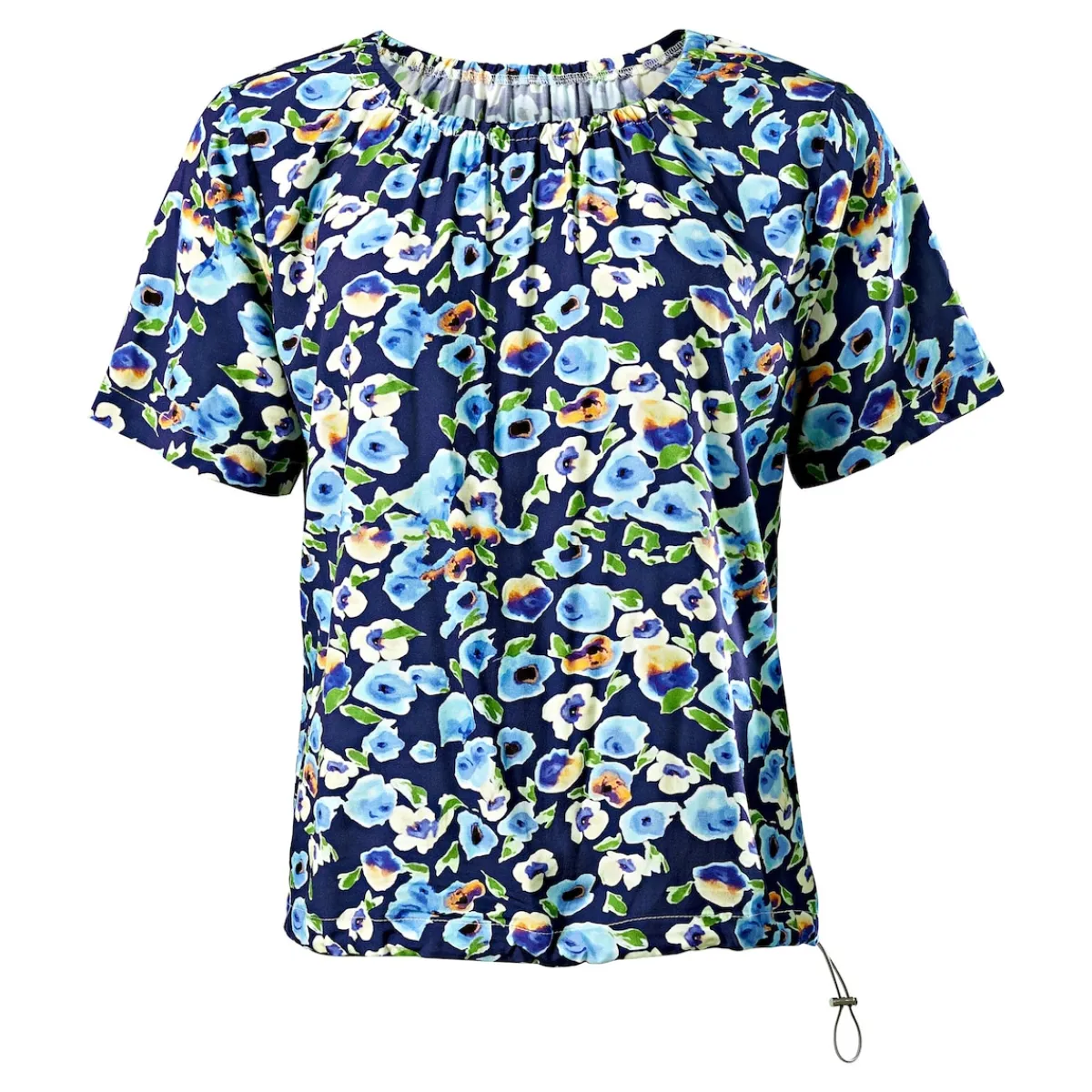 Fröhlich florales Design trifft auf unglaublich fließende, figurumspielende Schnitte und Stoffe. 1/4-Arm und Rundhalsausschnitt, Rückenlänge: 64 cm (bei Größe S)