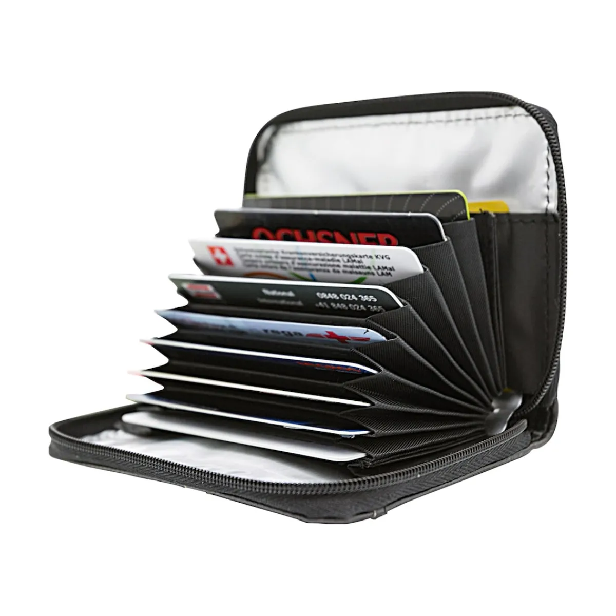 Eine Aluminiumschicht schützt Ihre Karten vor ungewolltem Auslesen. Das Portemonnaie bietet Platz für 11 Karten und Ausweise. Mit praktischem Rundum-Reißverschluss, damit die Karten nicht heraus rutschen können.