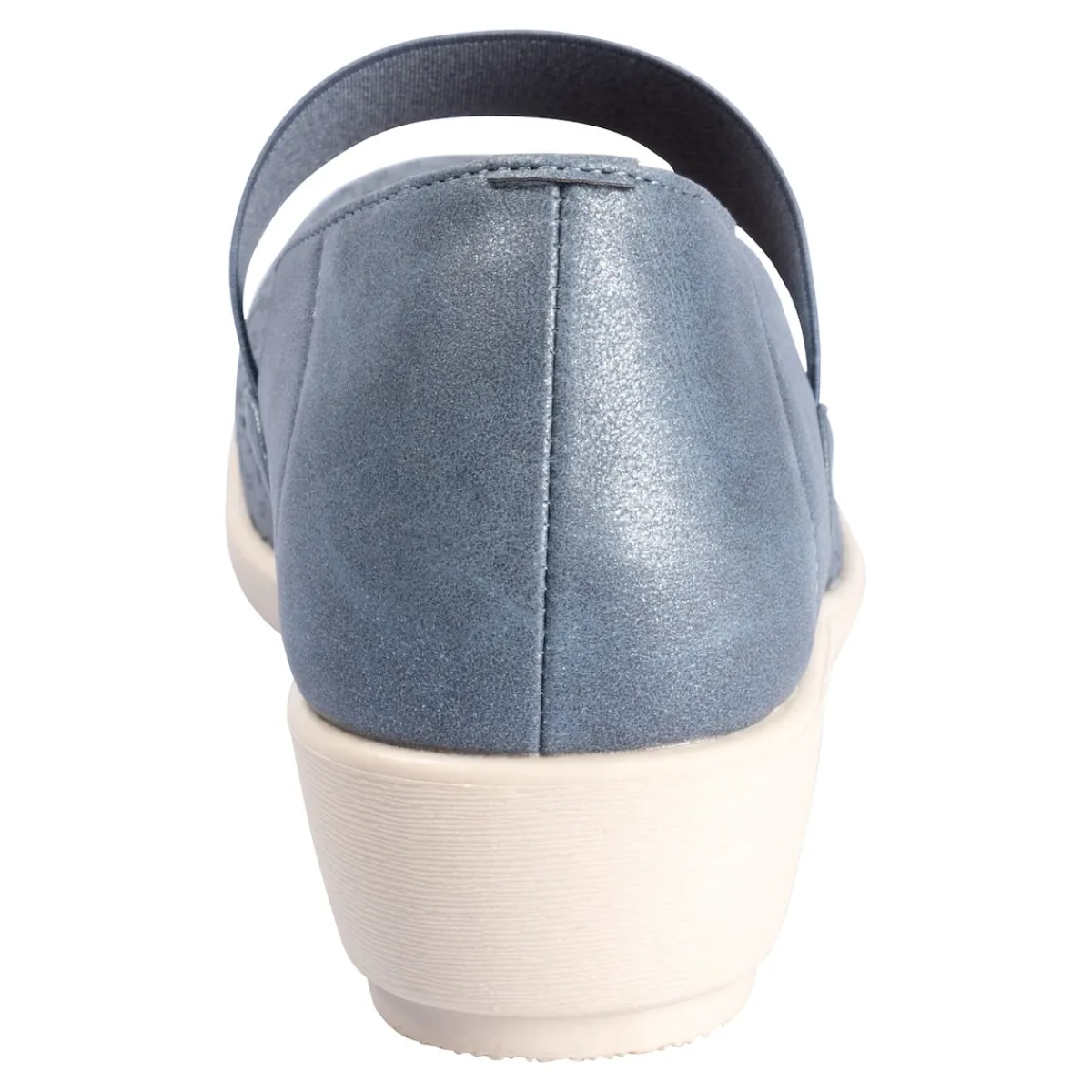Dieser edel schimmernde Ballerina schenkt Ihnen Komfort und Eleganz. Das Stretch-Riemchen passt sich Ihrem Fuß perfekt an und bietet optimalen Halt. Mit weicher Decksohle und rutschhemmendem Keilabsatz. Macht optisch einen schlanken Fuß.