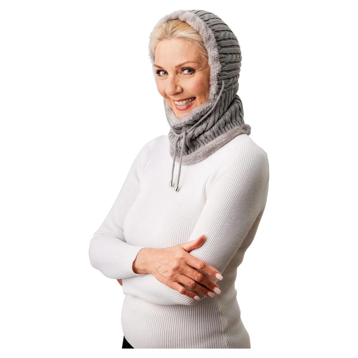 Kuschelige Wärme, die sich der Witterung anpasst: Bei Kälte ziehen Sie die flauschig gefütterte Kapuze über den Kopf und passen dank Kordelzug den kessen Kunstfellrand optimal an. Wird’s wärmer, erfreut Sie das Ensemble als Schal.
