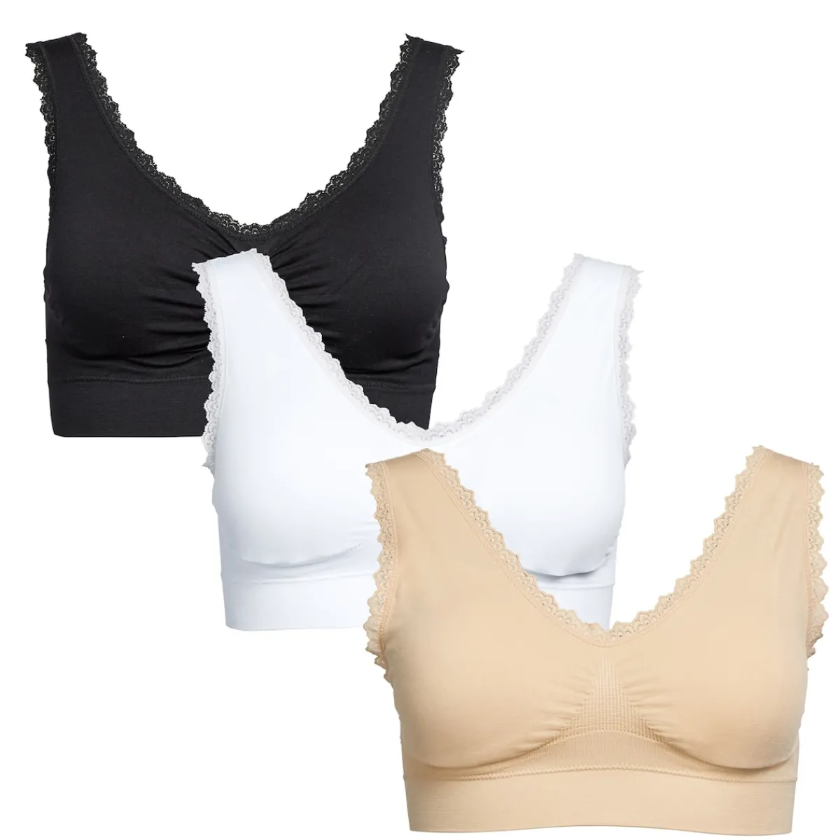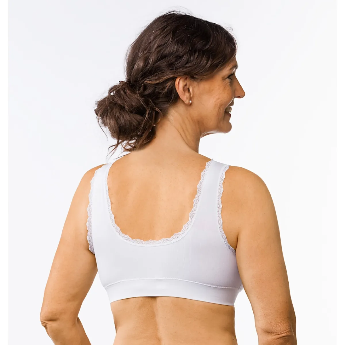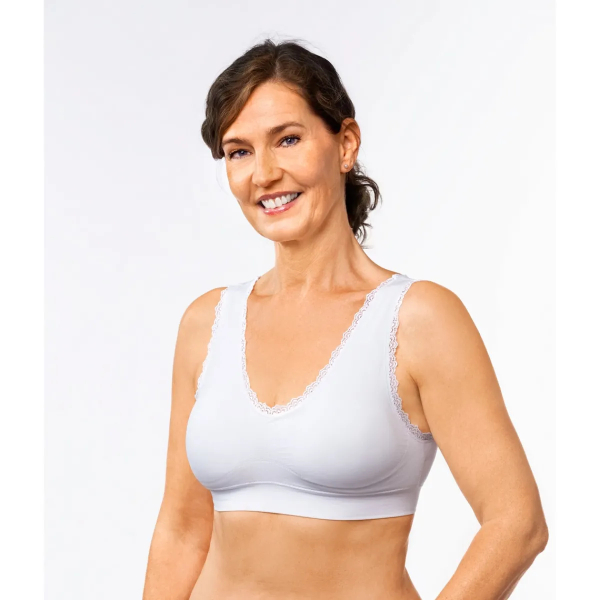 Nicht nur in Sachen Komfort, auch optisch kann sich der BH durchaus sehen lassen. Denn an den Trägern und dem Dekolleté ist er mit einer hübschen Spitze umsäumt, sodass es überhaupt nichts ausmacht, wenn unter dem Oberteil – absichtlich oder versehentlich – mal ein Stück BH hervorschaut.