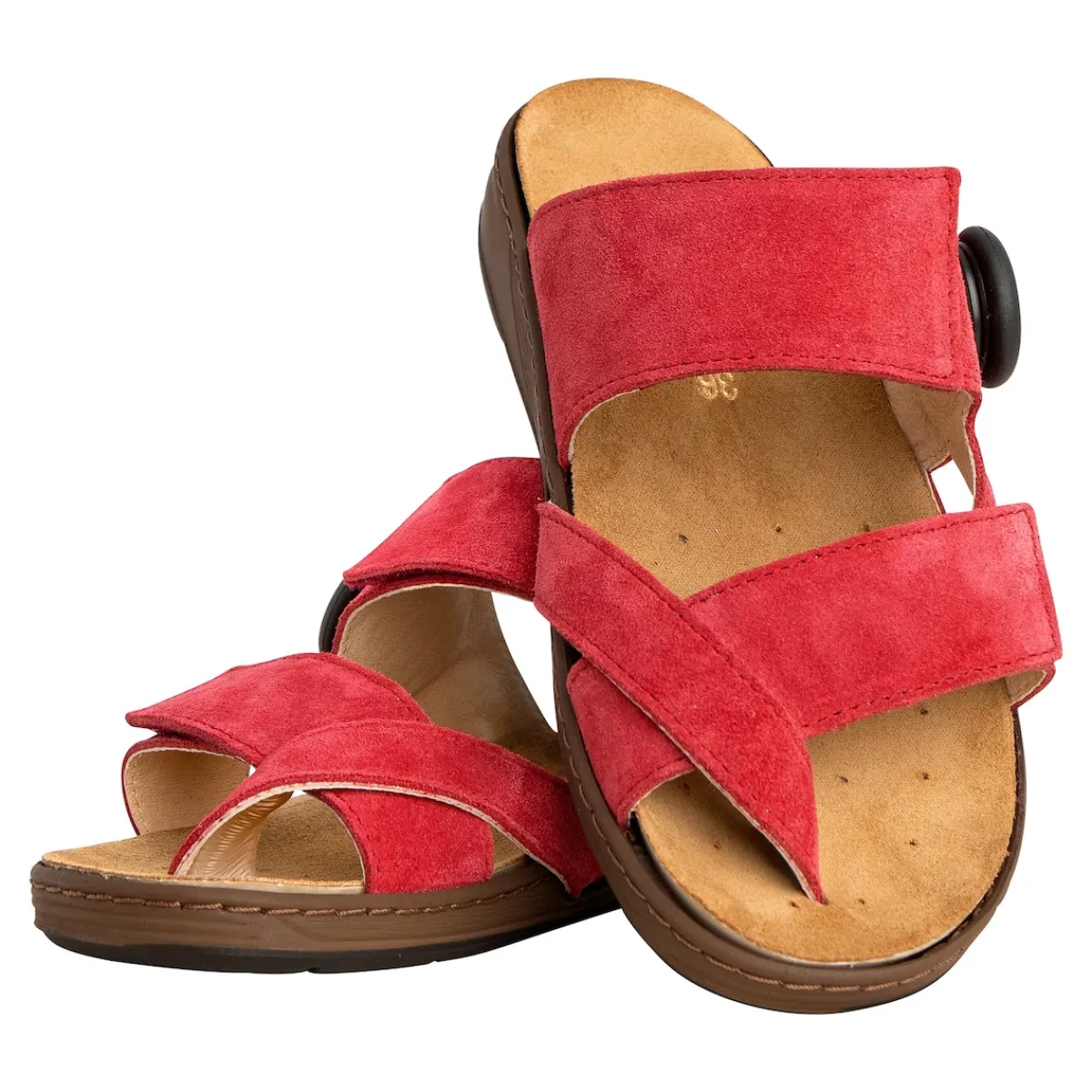 Mit Hilfe der individuell einstellbaren Großzehschlaufe wird die Fehlstellung des Hallux valgus sanft korrigiert. Die Pantolette BerryGo ist aus hochwertigem beerenfarbigen Veloursleder gearbeitet. Die bequeme BerryGo Pantolette bringt Farbe sowie Freude an den Füßen.