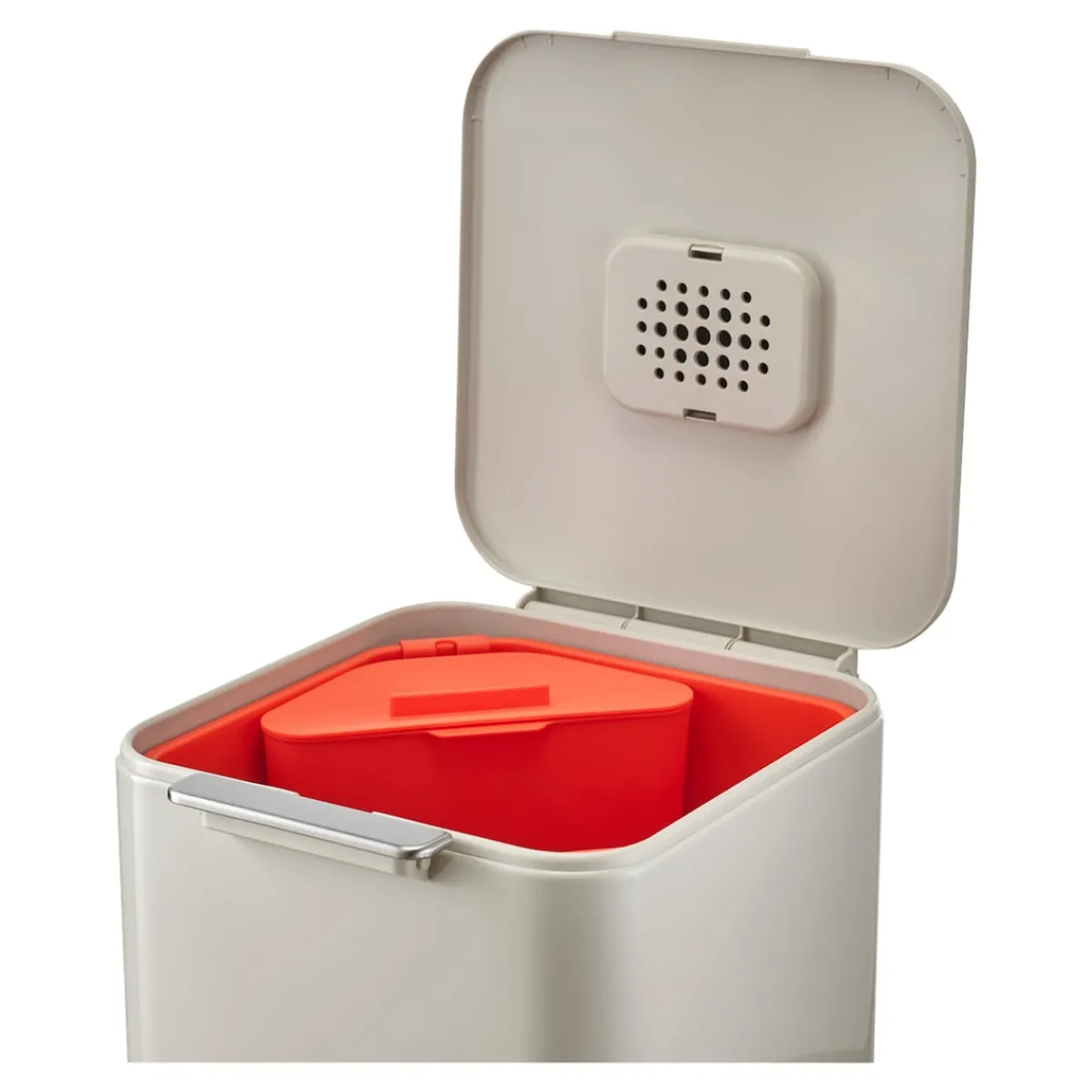 Der Totem Max überzeugt nicht nur durch sein modernes Design, sondern auch durch seine praktische Handhabbarkeit und Strapazierfähigkeit. Er verfügt über einen belüfteten Geruchsfilter im Hauptdeckel, der unangenehme Gerüche effektiv minimiert. Zusätzlich bietet der herausnehmbare Bioabfalleimer mit drei Litern Fassungsvermögen maximale Flexibilität. Er kann in einem der Fächer untergebracht oder zur Befüllung auf die Arbeitsfläche gestellt werden.
