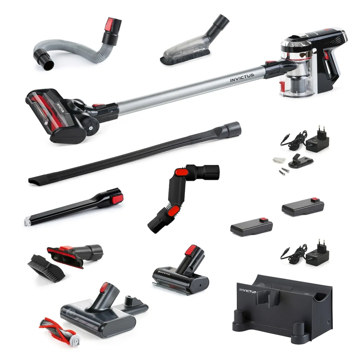 Für maximale Vielseitigkeit enthält der INVICTUS X9 eine Vielzahl an Zubehör: Von der flexiblen Fugendüse über die motorisierte Mini-Elektrobürste bis hin zur extra soften Abstaub-Bürste – jede Ecke, jede Oberfläche und jeder Winkel wird makellos sauber. Die praktische Ladestation mit Aufbewahrungsfunktion sorgt dafür, dass Ihr Staubsauger immer griffbereit und aufgeladen ist.