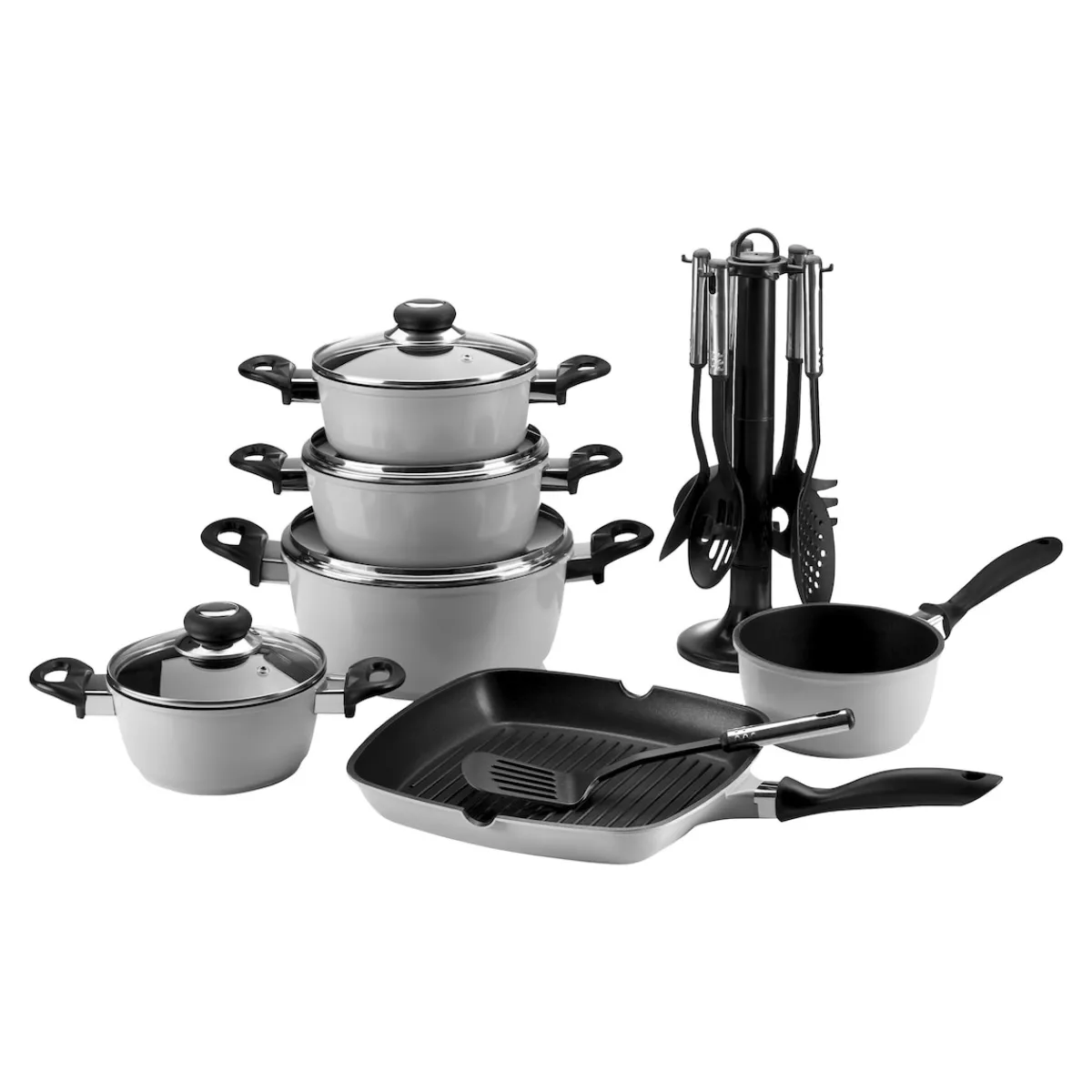 Das 17-teilige Aluguss-Topfset macht gesundes Kochen zum Kinderspiel. Die Töpfe und die Steakpfanne bestehen aus robustem Aluguss und sind mit komfortablen Kunststoffgriffen ausgestattet. Dank der hochwertigen Antihaft-Beschichtung benötigen Sie nur wenig Fett, was Ihre Gerichte besonders gesund macht. Die schwere Qualitätsausführung sorgt für eine optimale Wärmeverteilung und langanhaltende Wärmespeicherung. Die Töpfe sind hitzebeständig bis 180°C (mit Deckel bis 160°C) und spülmaschinenfest, was die Reinigung erleichtert. Zusätzlich enthält das Set sechs praktische Küchenhelfer und einen Ständer, die Ihnen die Zubereitung Ihrer Gerichte erleichtern. Geeignet für alle Herdarten außer Induktion.
