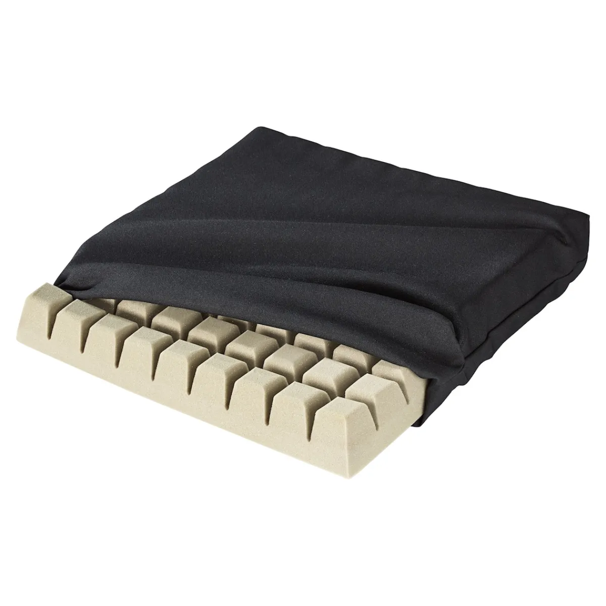 Dekubitus vorbeugen. Ermüdungsarmer Spezialschaumstoff in Würfelsegmenten gleicht hier Druck angenehm aus. Luftkanäle zwischen den Würfelreihen sorgen für gute Luftzirkulation und ein angenehmes Sitzklima.