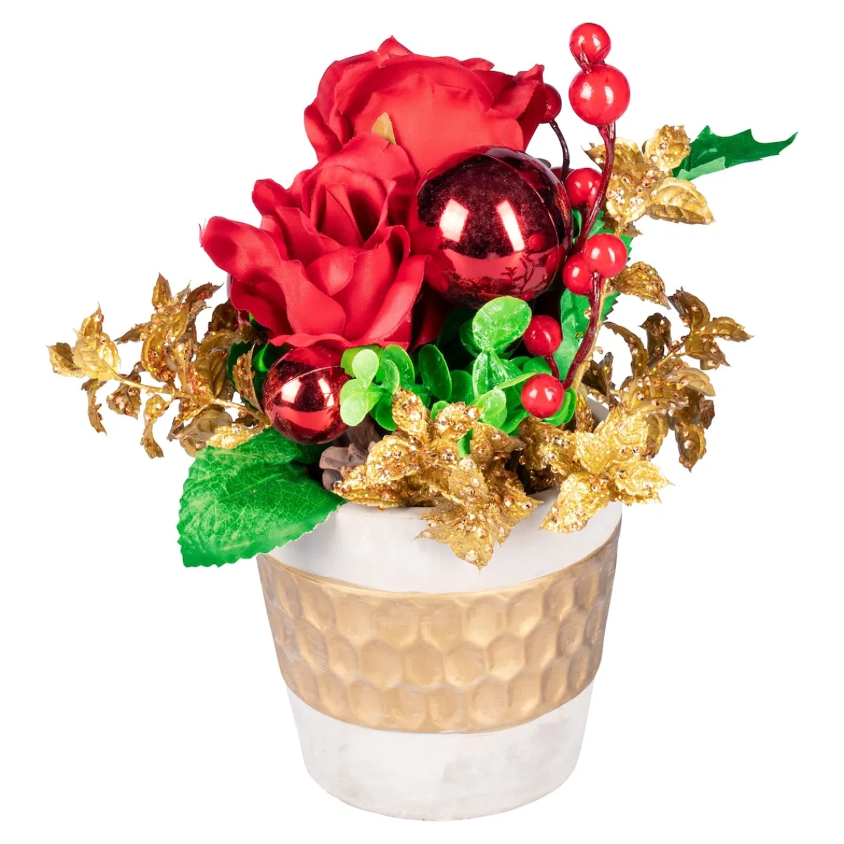 Setzen Sie stilvolle Akzente in der Weihnachtszeit mit diesem charmanten Arrangement. Die elegante Rose im dekorativen Topf passt perfekt auf Tische, Fensterbänke oder als Geschenk. Langlebig und pflegeleicht!