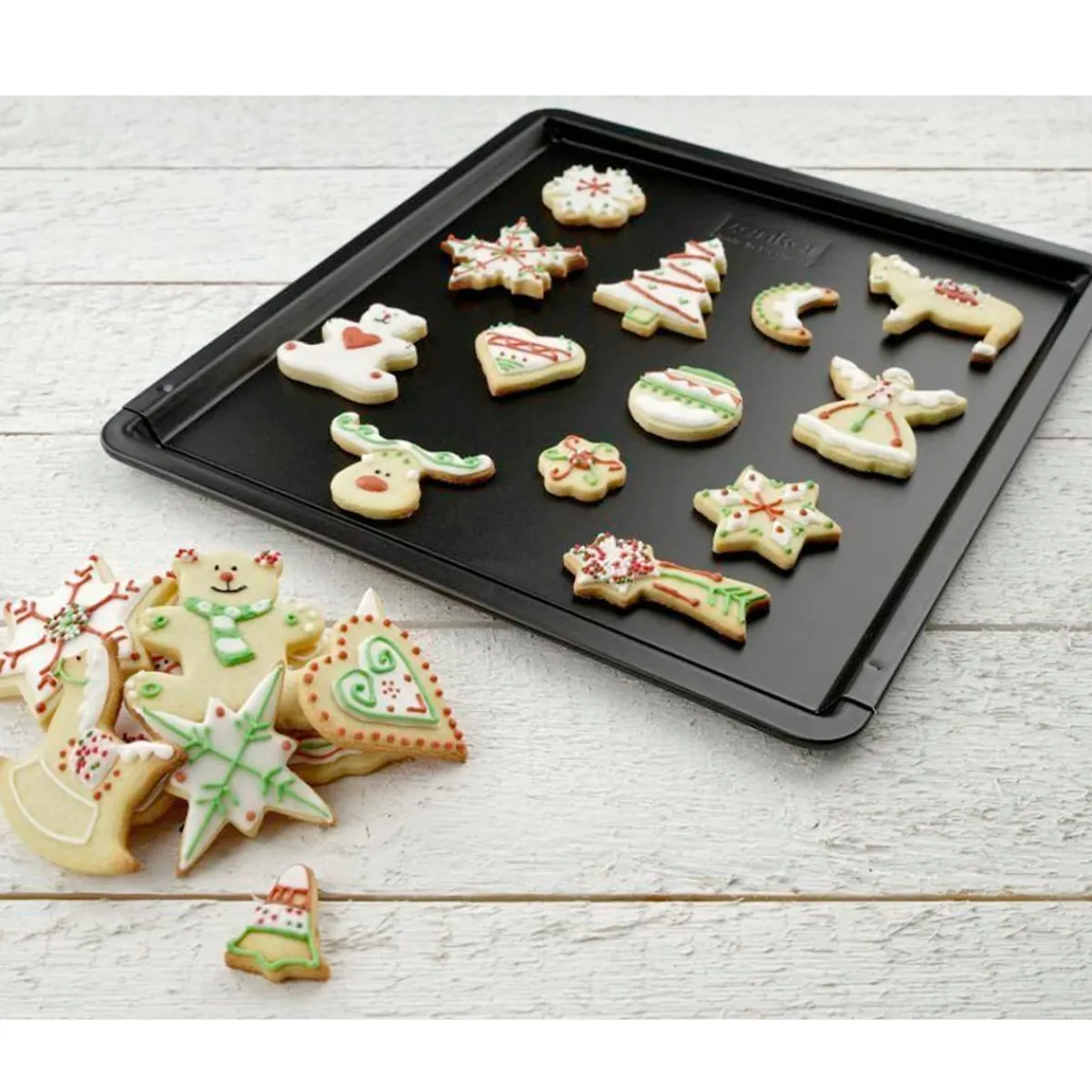 Das Blech ist hitzebeständig bis 230 °C und somit ideal für alle gängigen Plätzchen- und Kuchenrezepte, aber auch für herzhafte Speisen geeignet. Die gute Antihaftbeschichtung Teflon Classic sorgt dafür, dass das Backwerk nicht am Blech haften bleibt, sondern sich auch ohne Backpapier nach dem Backen mühelos lösen lässt. Das vereinfacht natürlich die Reinigung: Waschen Sie das Blech einfach mit etwas Spülwasser feucht aus und lassen Sie es trocknen. Hierzu können Sie die beiden Blechhälften bei Bedarf trennen.