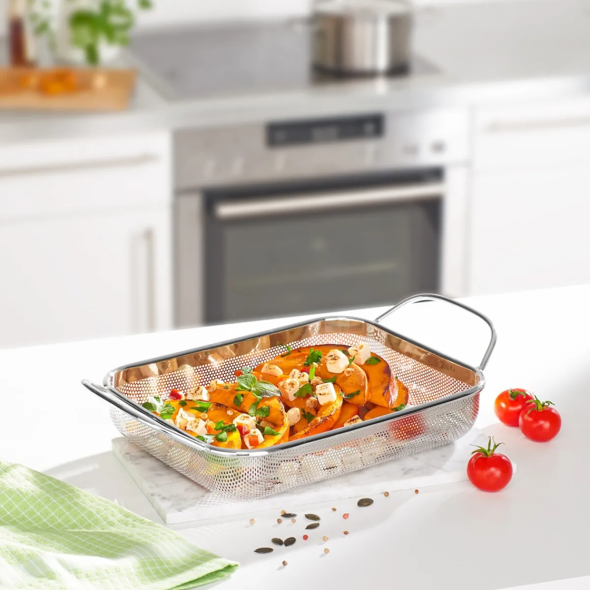 Sie lieben Hähnchen, Pommes und Ofengemüse, aber so richtig knusprig wird es nie? Auf dem Backblech oder -rost platziert, lässt die Lochstruktur dieser Schale von allen Seiten Luft zirkulieren: Feuchtigkeit und Fett können entweichen – für gleichmäßig gegarte und krosse Ergebnisse.