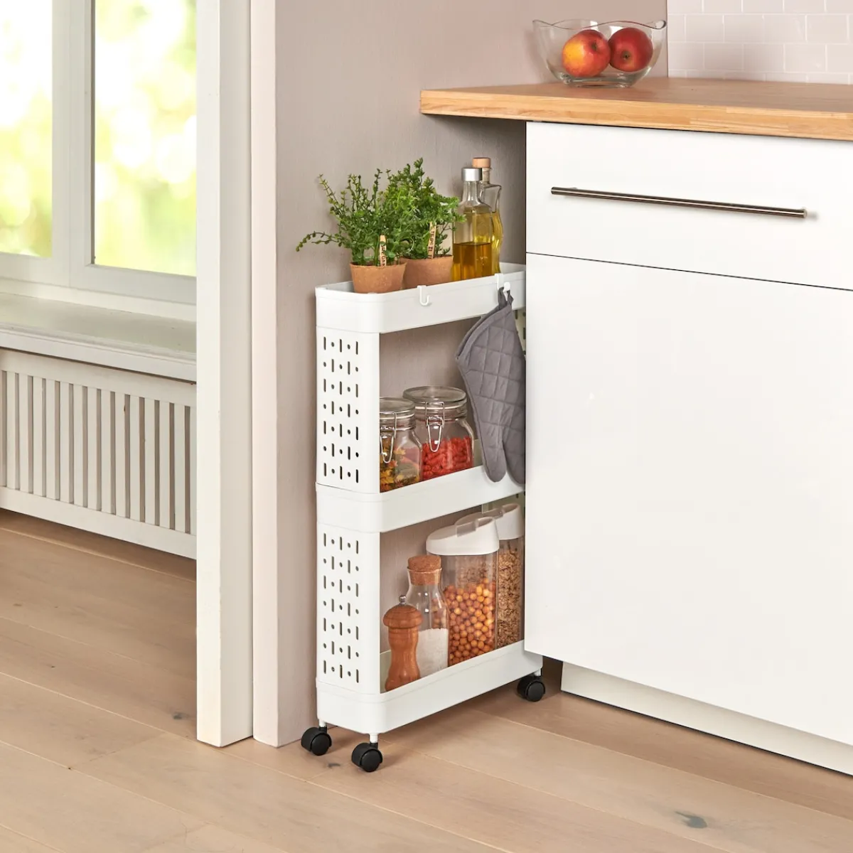Nicht nur im Bad sorgt dieser Rollwagen für mehr Stauraum – auch in Küche, Abstellraum & Co. macht er sich stets nützlich. Auf seinen Rollen folgt er Ihnen überall hin, wo Ordnung angesagt ist! Passt sogar in schmale Nischen. In 2 Größen erhältlich.