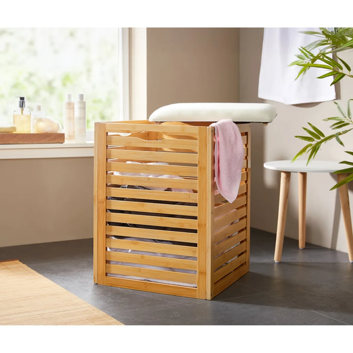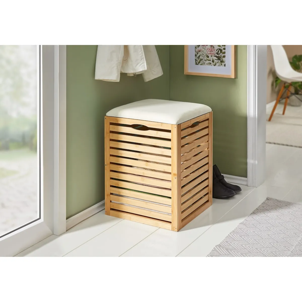 Wohin mit schmutziger Wäsche oder Decken? Dieser praktische und kompakte Hocker bietet Ihnen viel Volumen dafür und ist zugleich luftdurchlässig. Mehr noch: Dank gepolstertem Deckel macht er auch als flexibles Sitzmöbel eine gute Figur.