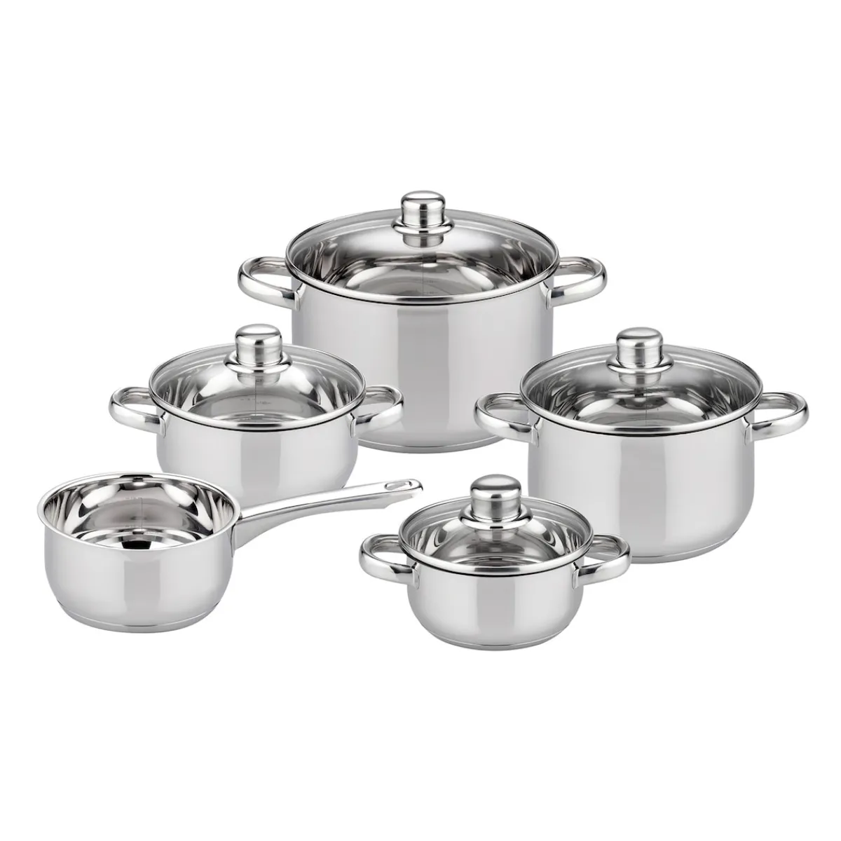 1 x Topf mit Glasdeckel 5,5 l, 1 x Topf mit Glasdeckel 3,2 l, 1 x Topf mit Glasdeckel 1,2 l, 1 x Bratentopf, 1 x Stielkasserolle
