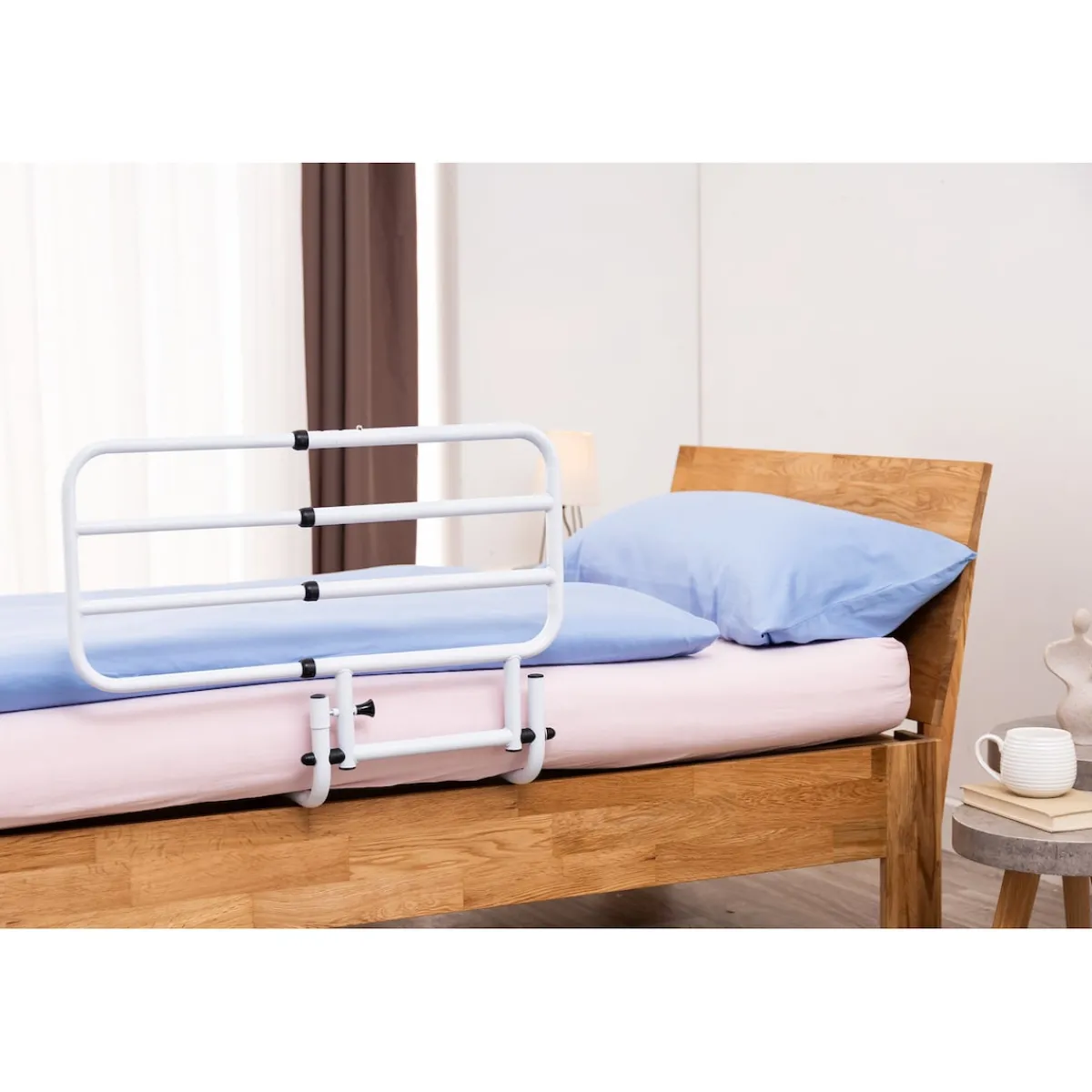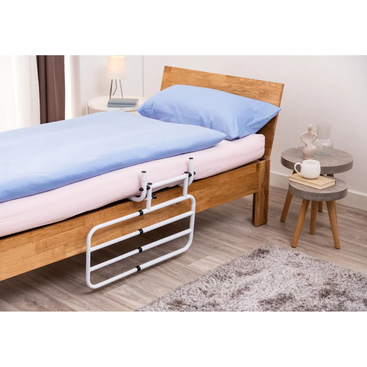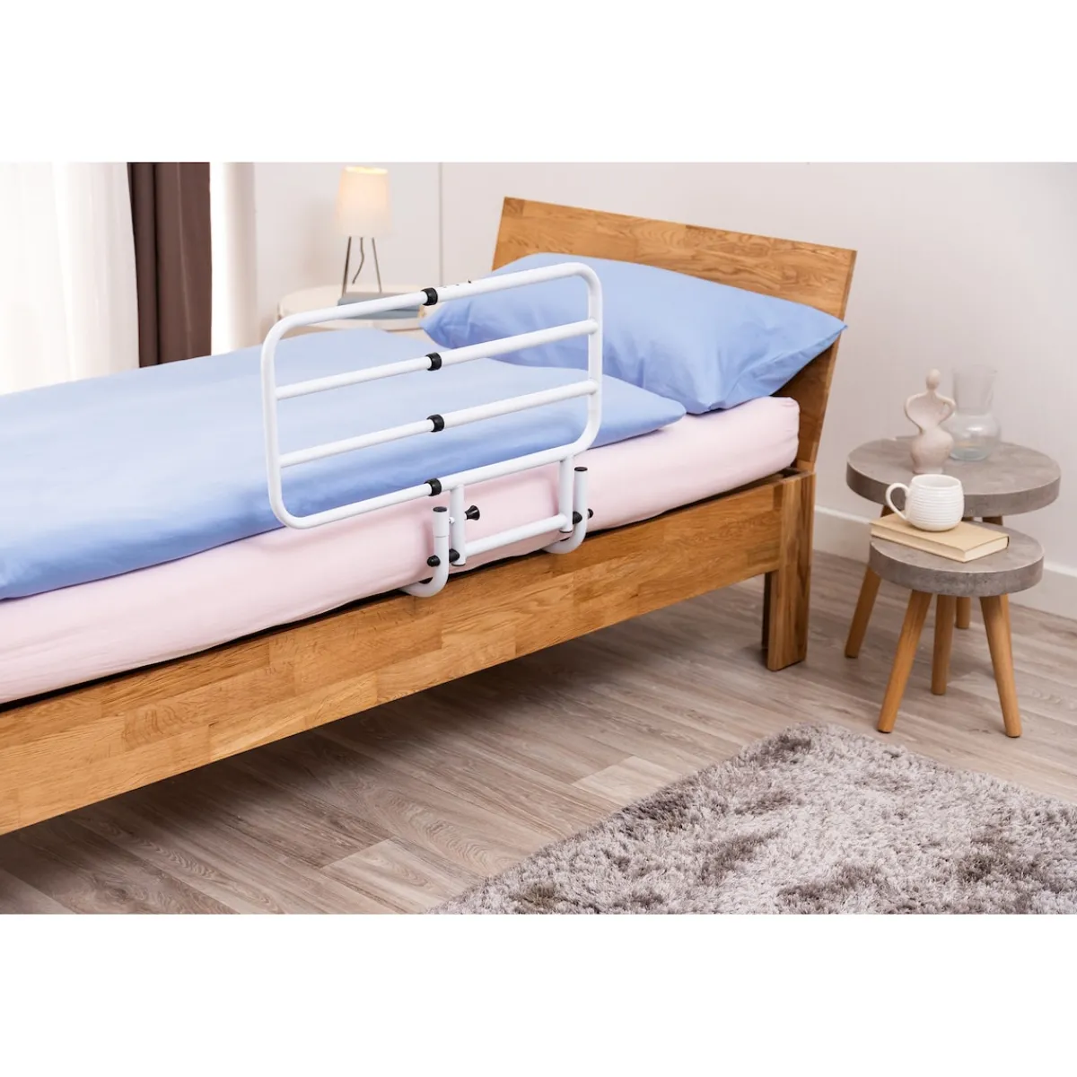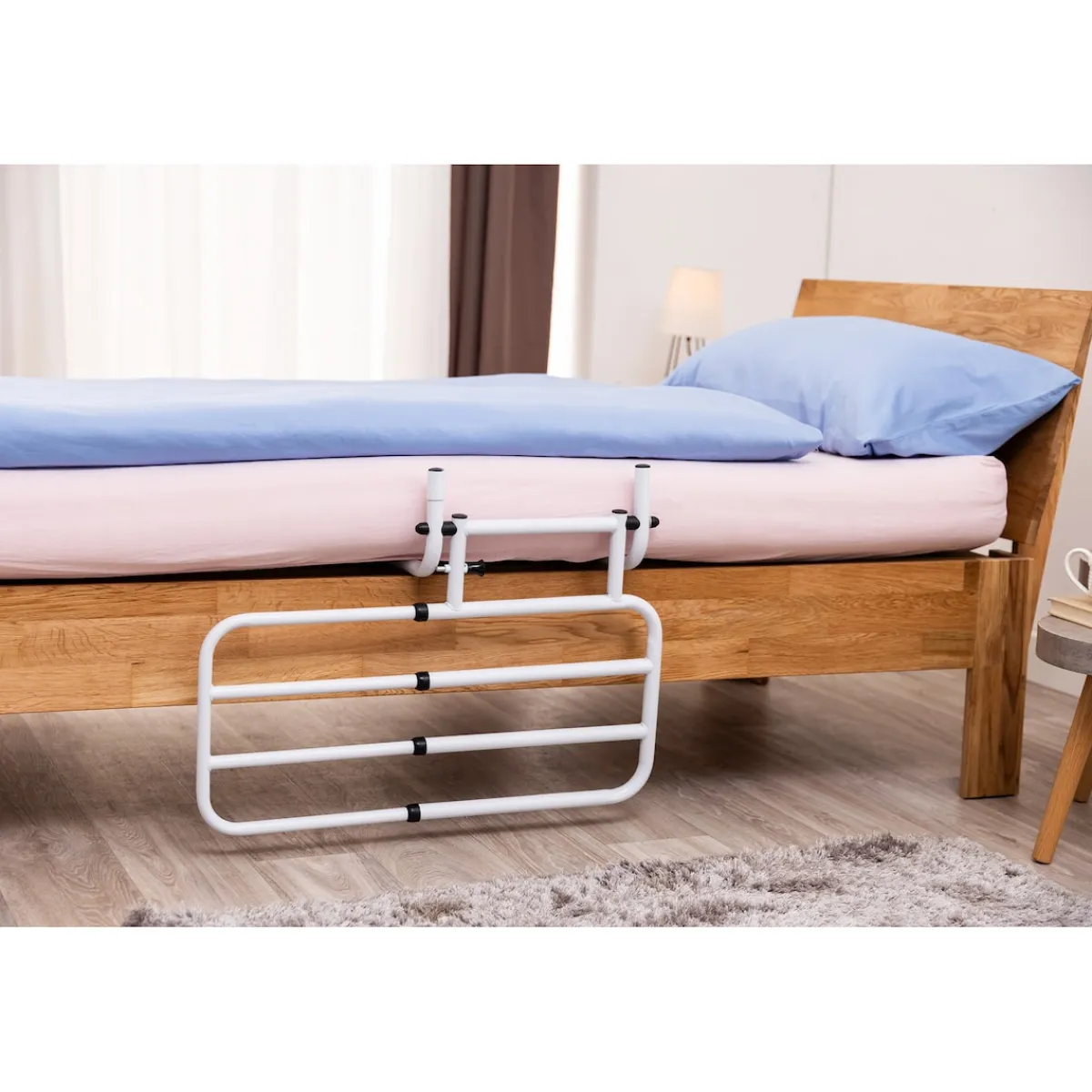 Wenn das Hinsetzen, Aufrichten oder Aufstehen aus dem Bett alters-, krankheits- oder verletzungsbedingt schwierig wird, braucht es eine ebenso einfache wie praktische Lösung. Zum Beispiel ein ausziehbares Bettgeländer. Sein Seitenteil dient als Stütze beim Hochziehen im Bett und hilft beim Hinsetzen und Aussteigen aus dem Bett. Damit sorgt es für mehr Unabhängigkeit, Komfort und Sicherheit. Und es erfüllt noch einen anderen Sicherheitszweck: Dank seiner Höhe von 50 Zentimetern verhindert das Seitenteil als natürliche Begrenzung ein Hinausfallen aus dem Bett – selbst bei einem sehr unruhigen Schlaf kann hier nichts passieren.