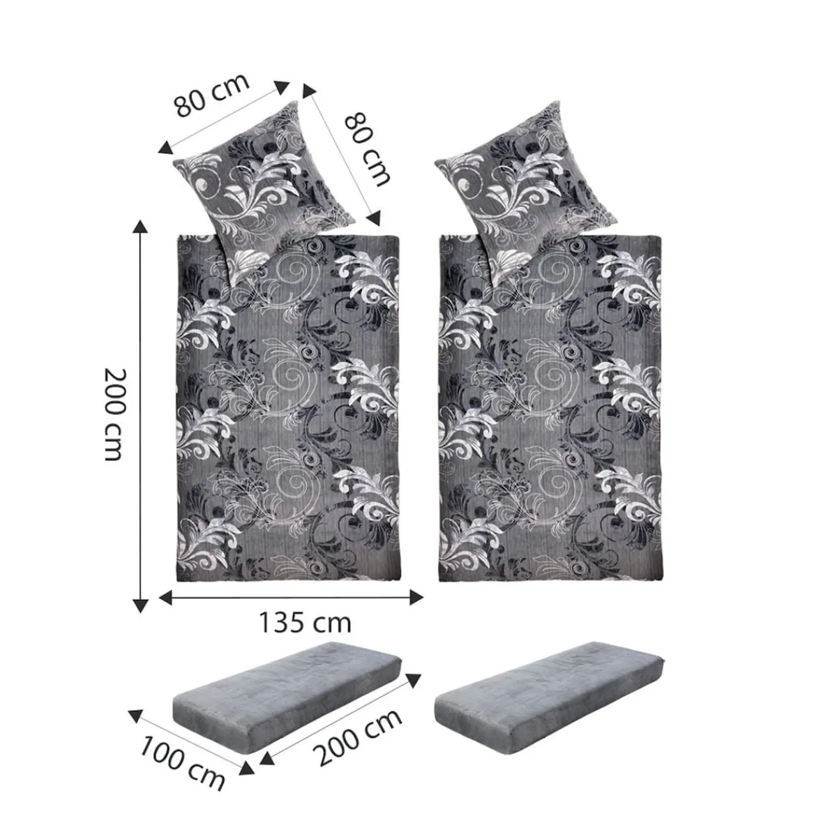 Abmessungen: Bettbezug: (LxB)200x135cm, Kissenbezug: (LxB) 80x80cm, Spannbettlaken: (LxB) 200x100cm