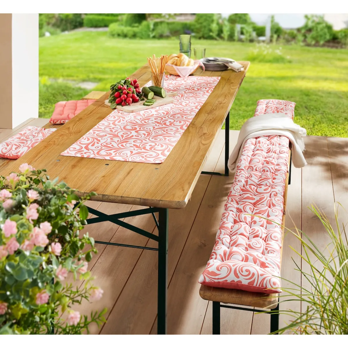 Lieferumfang: 1x Tischläufer, 2x Bierbankauflage