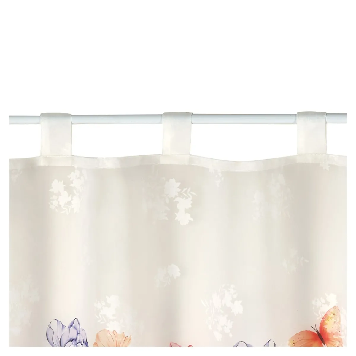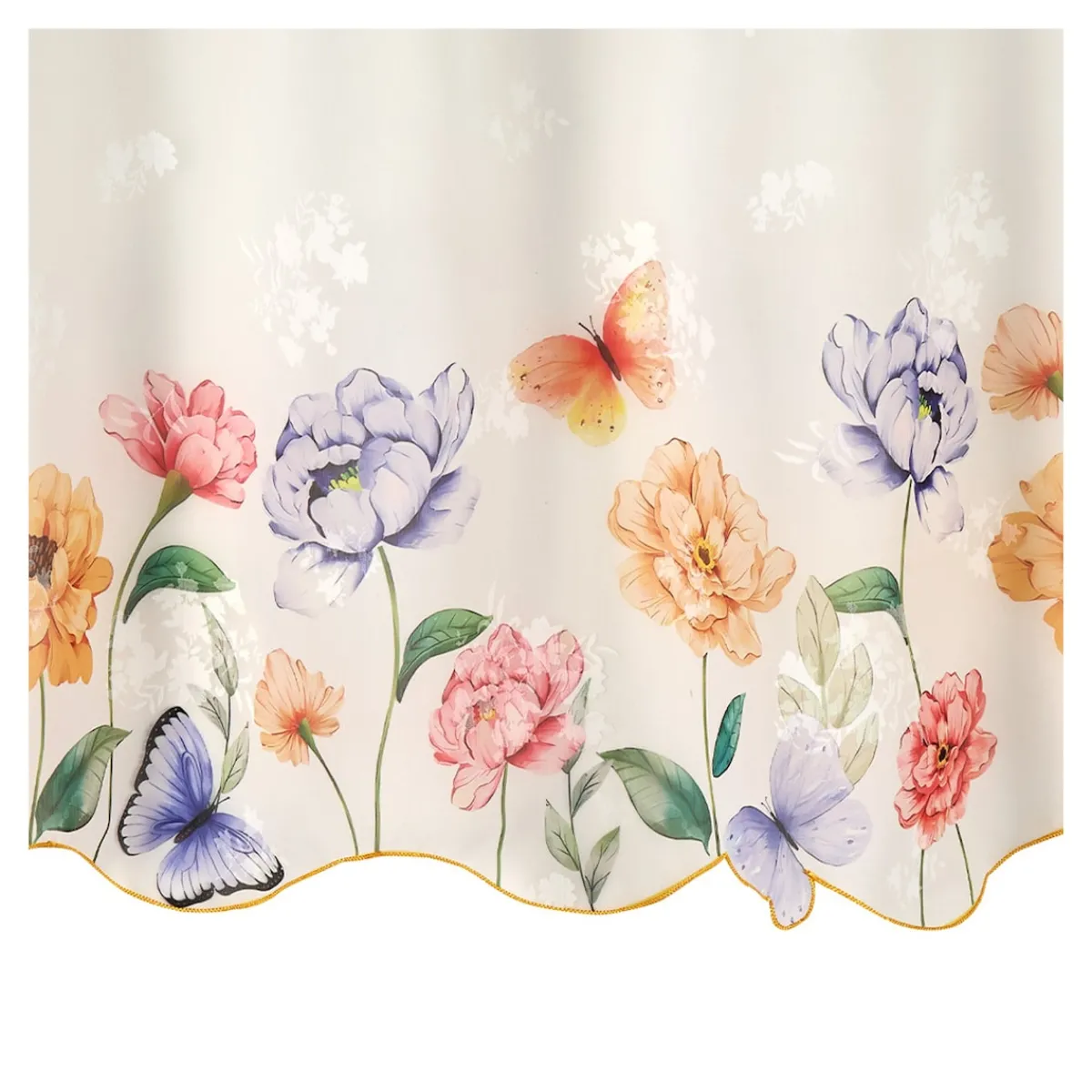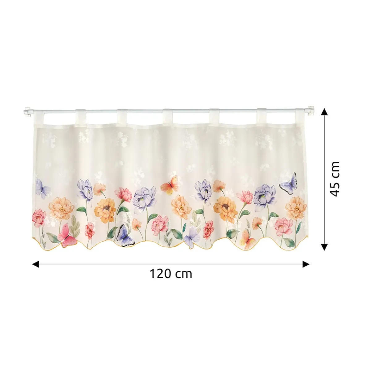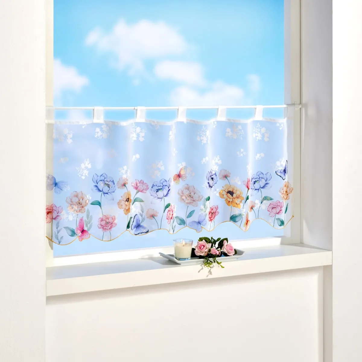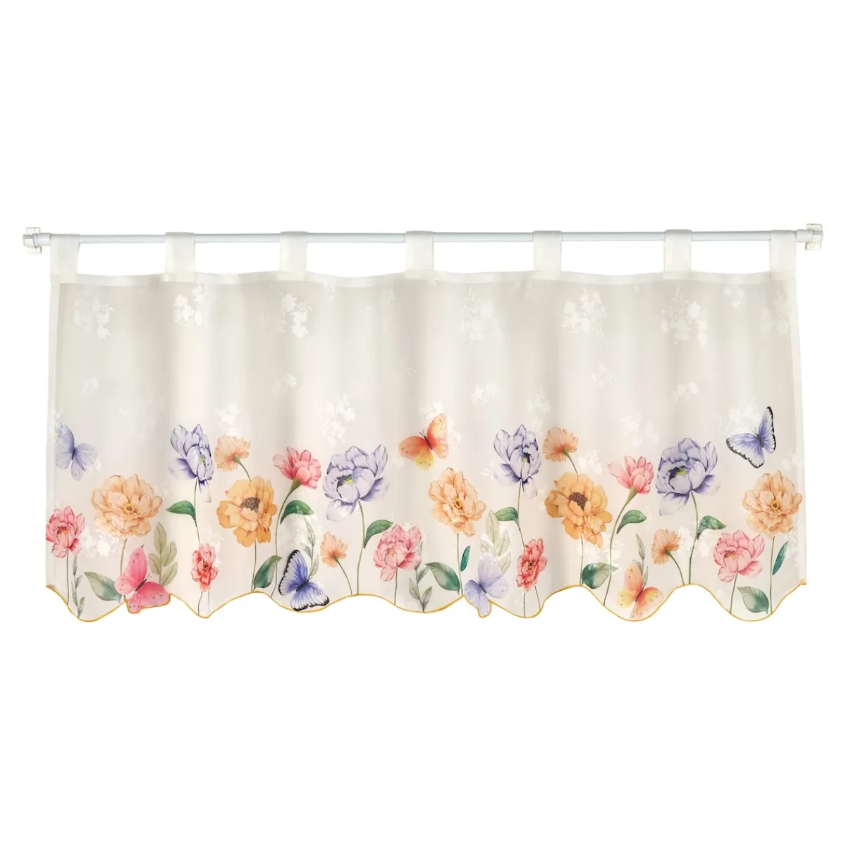 Mit dieser romantischen Bistrogardine blüht Ihr Zuhause so richtig auf. In perfekt aufeinander abgestimmten Farben zaubert sie ein Blumenmeer und filigrane Schmetterlinge ans Fenster. Mit dekorativer Bogenkante.