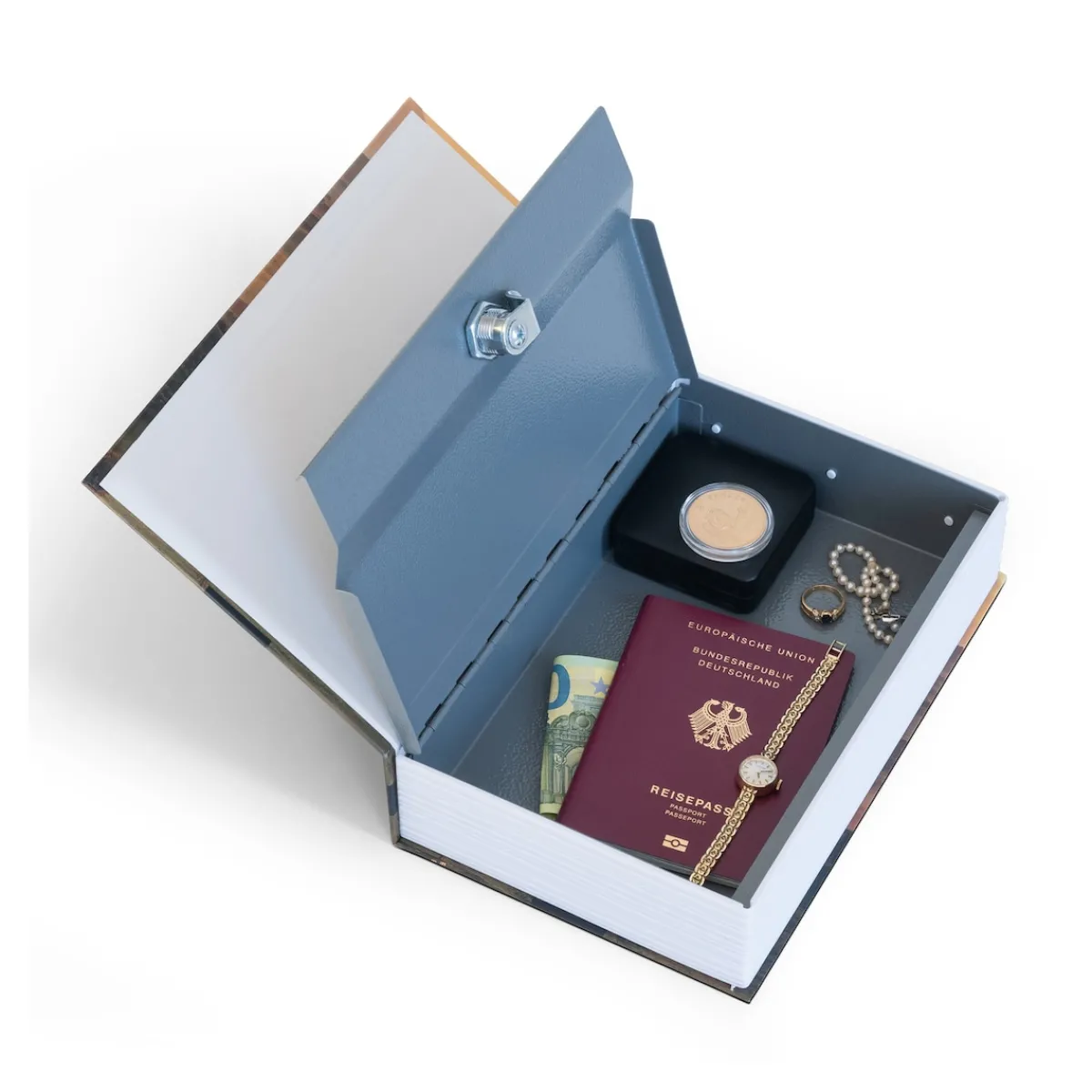 Mit einem realistischen Kunststoffbuchdesign bleibt er unauffällig. Dank seiner kompakten Größe lässt er sich leicht mitnehmen. Sie erhalten zwei Schlüssel mit individueller Nummer für höchste Sicherheit.