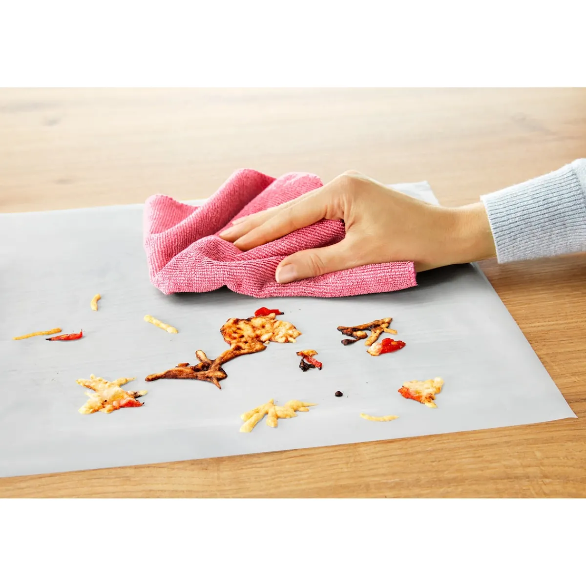 Weil das niemand gerne macht, gleich die Dauer-Backfolie mitbestellen. Die hält das Backblech dauerhaft sauber, lässt sich feucht abwischen und bis zu 1.000 Mal wiederverwenden.