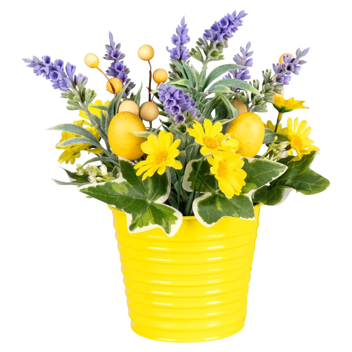 Dieses anmutende Ostergesteck versprüht den Charme von Lavendelfeldern der Provence. Blumen und Ostereier sind harmonisch im Metalltopf arrangiert.