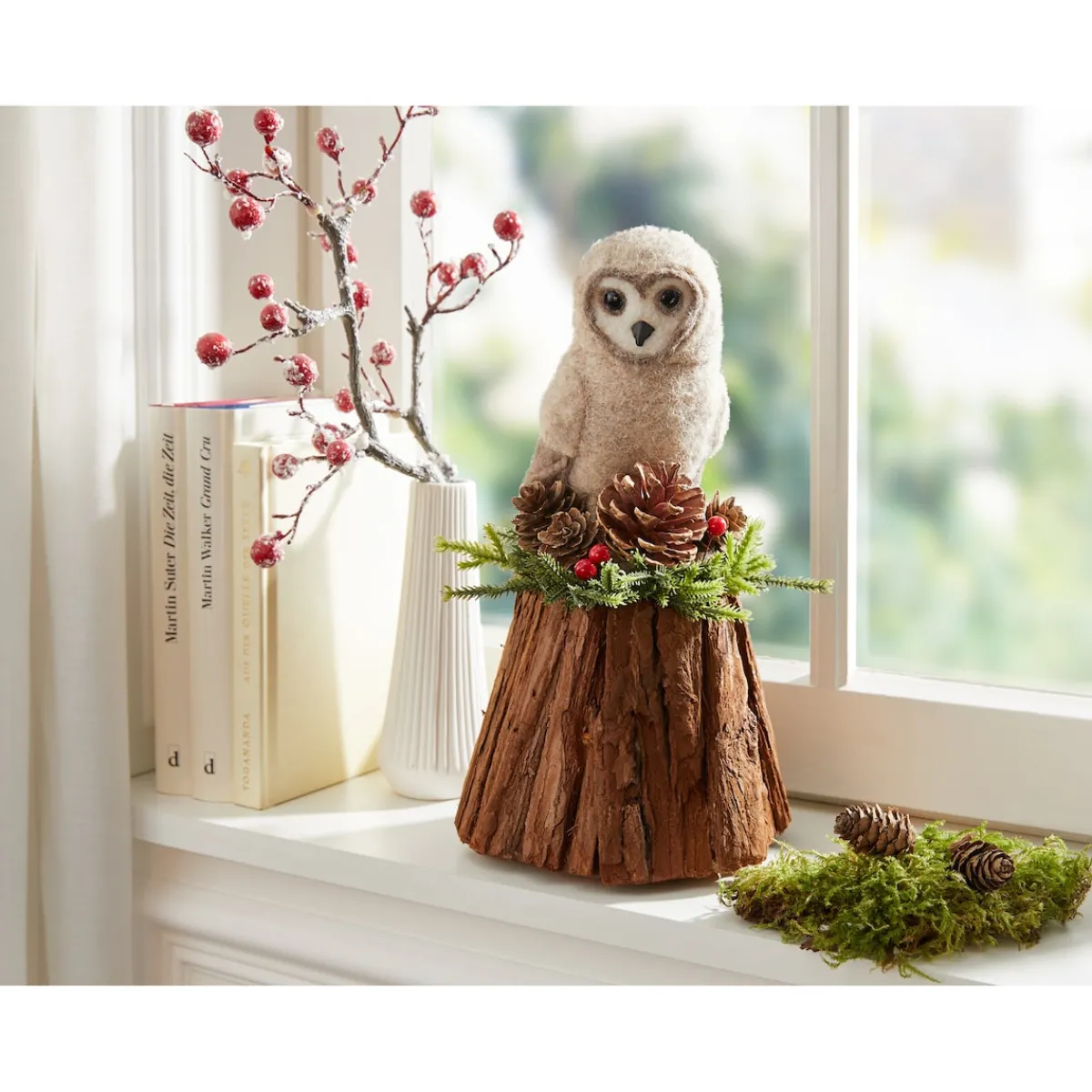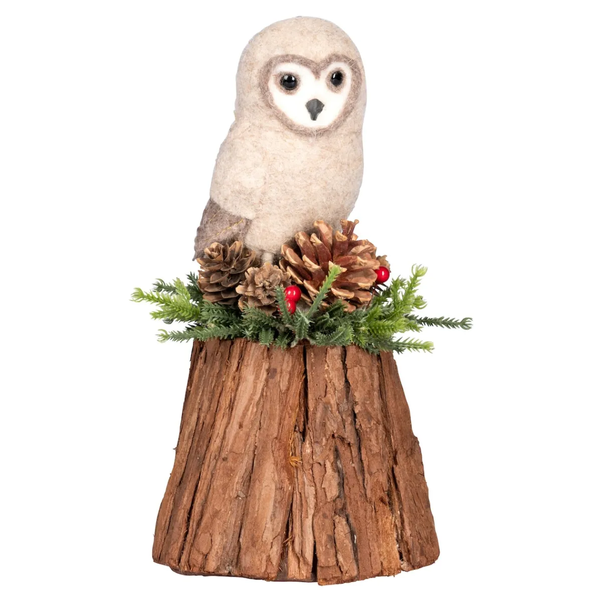 Die liebevoll gearbeitete Filz-Eule „Elvira“ thront stolz auf ihrem mit Zweigen und Zapfen geschmückten Baumstumpf. Von hoch oben bewacht sie ihr Zuhause und würde weise Ratschläge geben, wenn sie sprechen könnte.