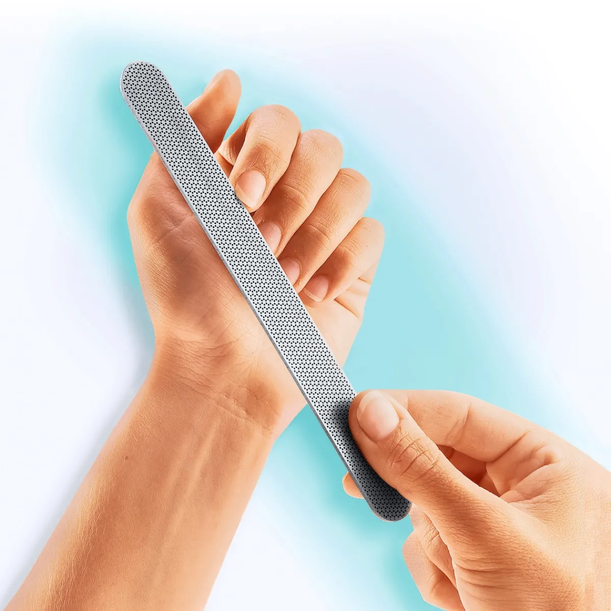 Diese abgerundete Profi-Feile mit elastischem Kern aus Fiberglas sorgt nicht nur für Nägel in Topform, sondern eignet sich auch ideal zum Entfernen von Hornhaut. Mit Körnung aus Korund und Diamantstaub.