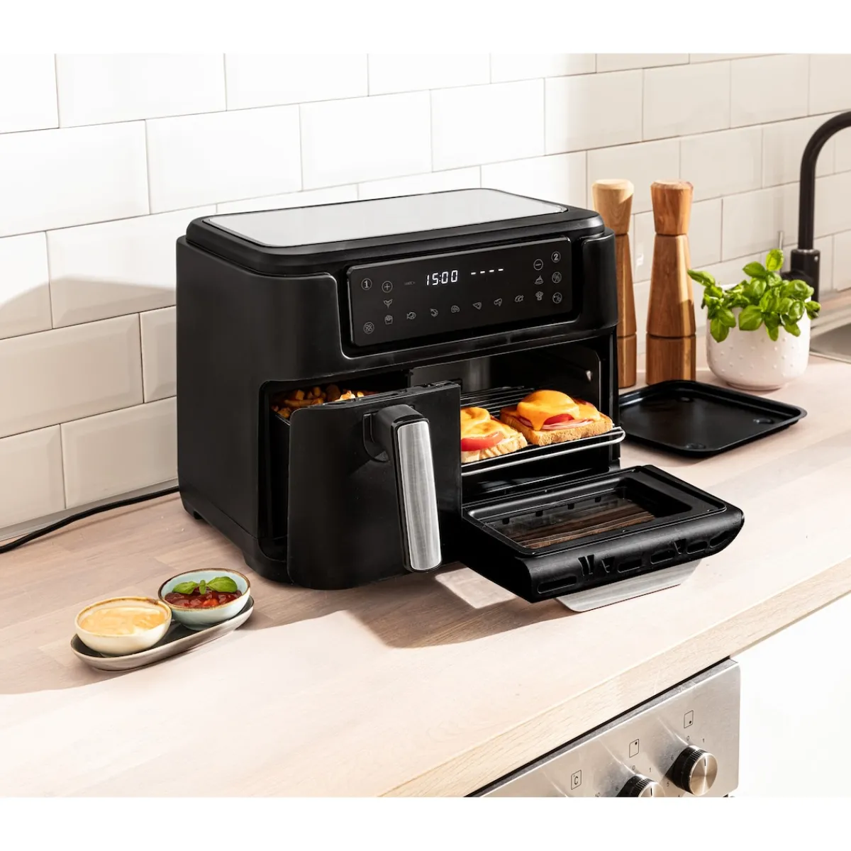 - ersetzt ganz kompakt Backofen, Fritteuse, Toaster, Mikrowelle, Grill, Sandwichmaker und Pfanne