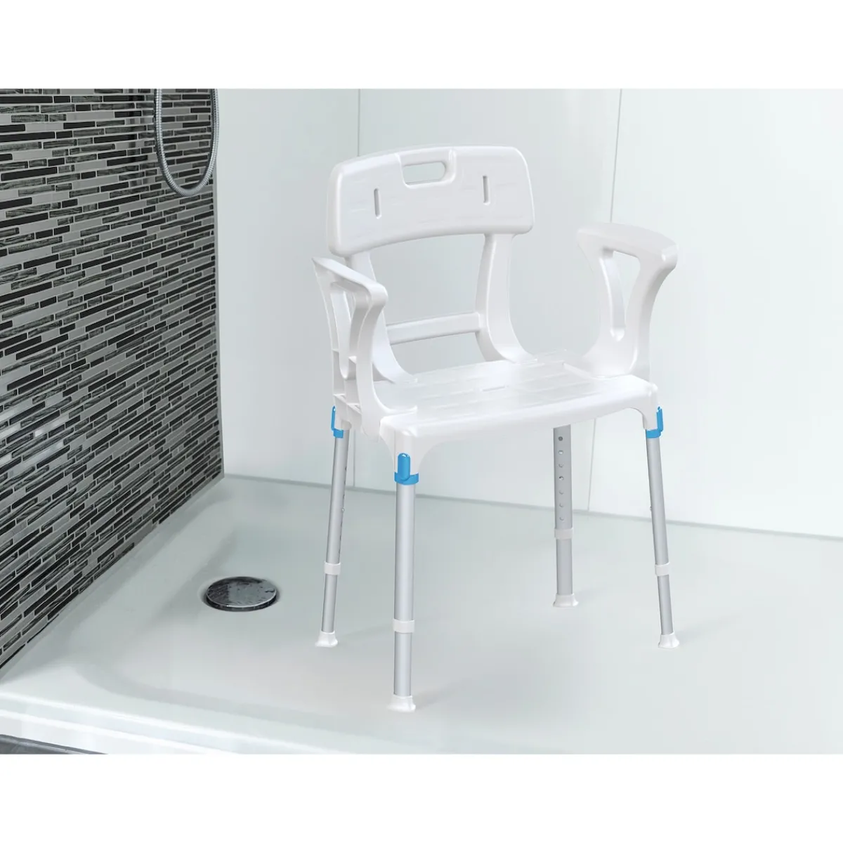Der höhenverstellbare Duschstuhl mit breiter Sitzfläche aus der Serie laguna vereint schickes Design mit höchster Qualität und Flexibilität. Die Rückenlehne und Armlehnen sorgen für maximalen Komfort und noch mehr Sicherheit beim Duschen. Der Hygieneausschnitt unterstützt bei der Körperhygiene.