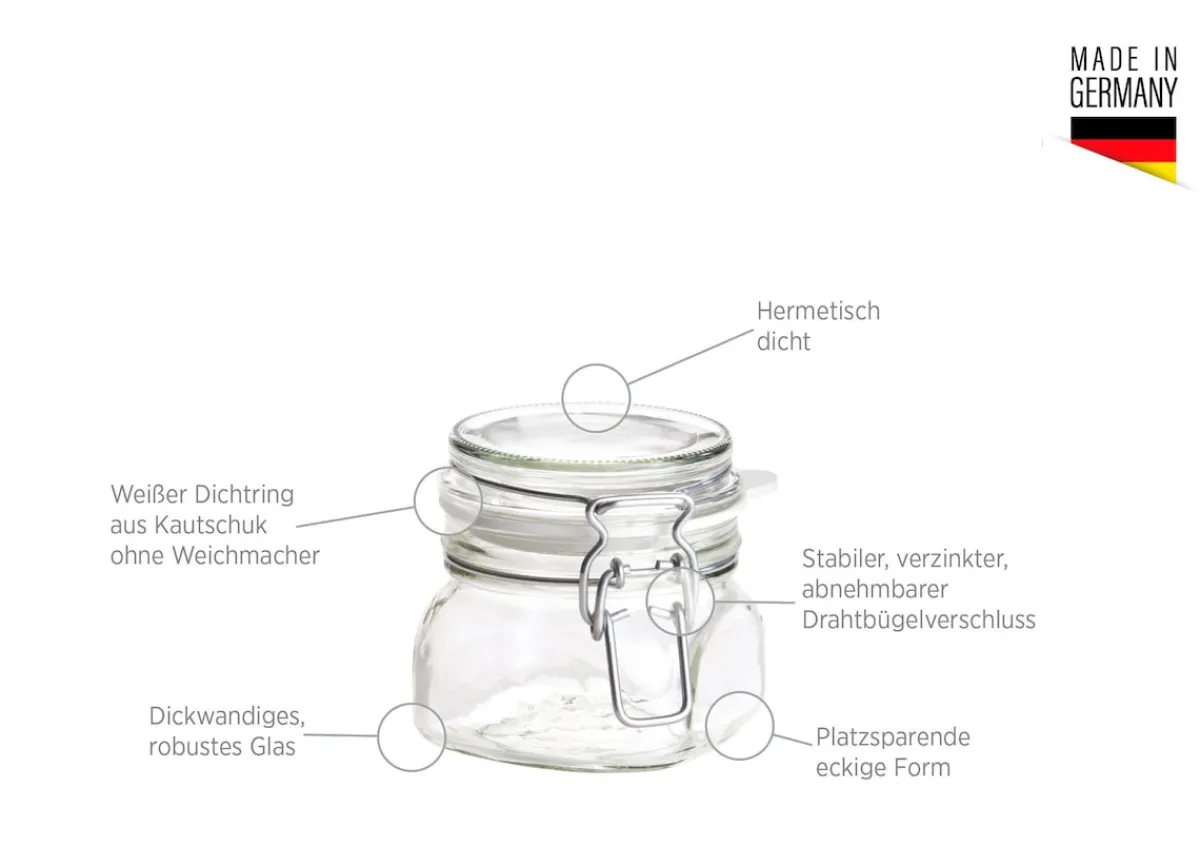 Die dickwandigen Einkochgläser sind spülmaschinentauglich, backofengeeignet und können auch im Tiefkühler eingefroren werden. Besonders die praktische eckige Form ermöglicht äußerst platzsparendes Lagern.