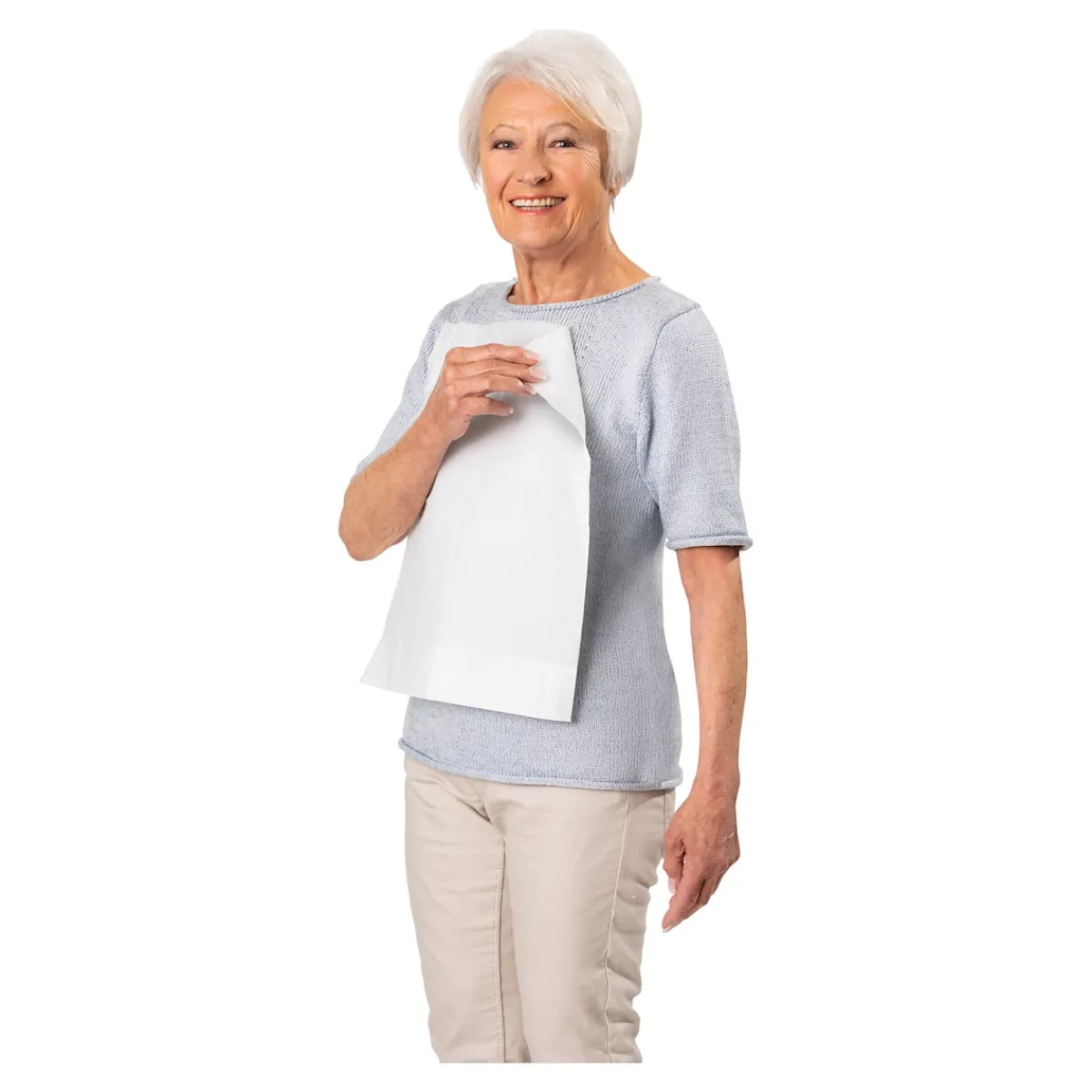 Mit diesen praktischen Einweglätzchen bleibt Kleidung sauber, auch wenn mal etwas daneben geht. Dafür sorgt die saugfähige Qualität und die Auffangtasche vorn. Ideal für den Einsatz in der Patienten- und Altenpflege.