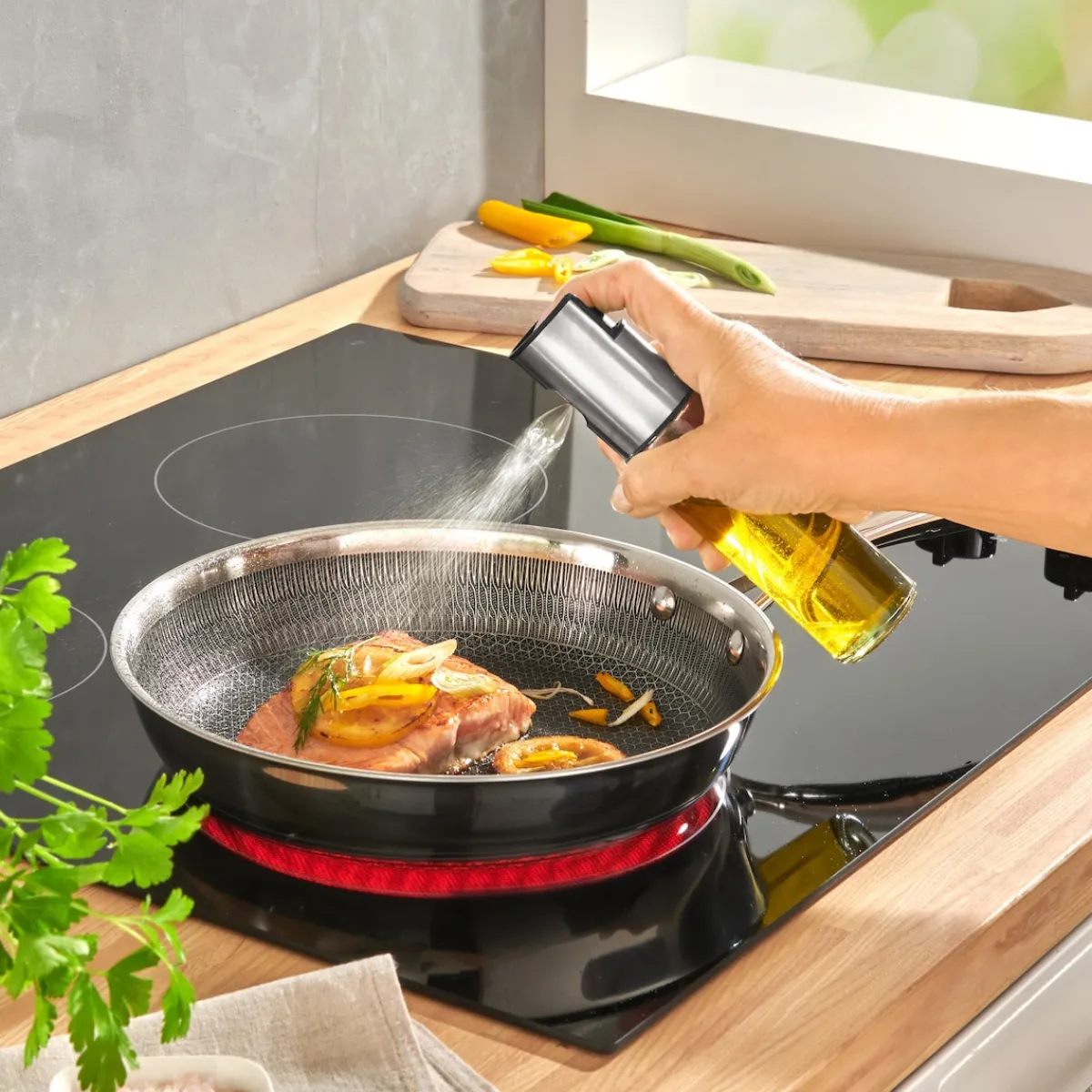 Perfekt und sauber dosiert: Mit einem leichten Druck auf den Deckel versprühen Sie Essig oder Öl fein und gleichmäßig – ideal zum Verfeinern von Salaten oder zum Braten.