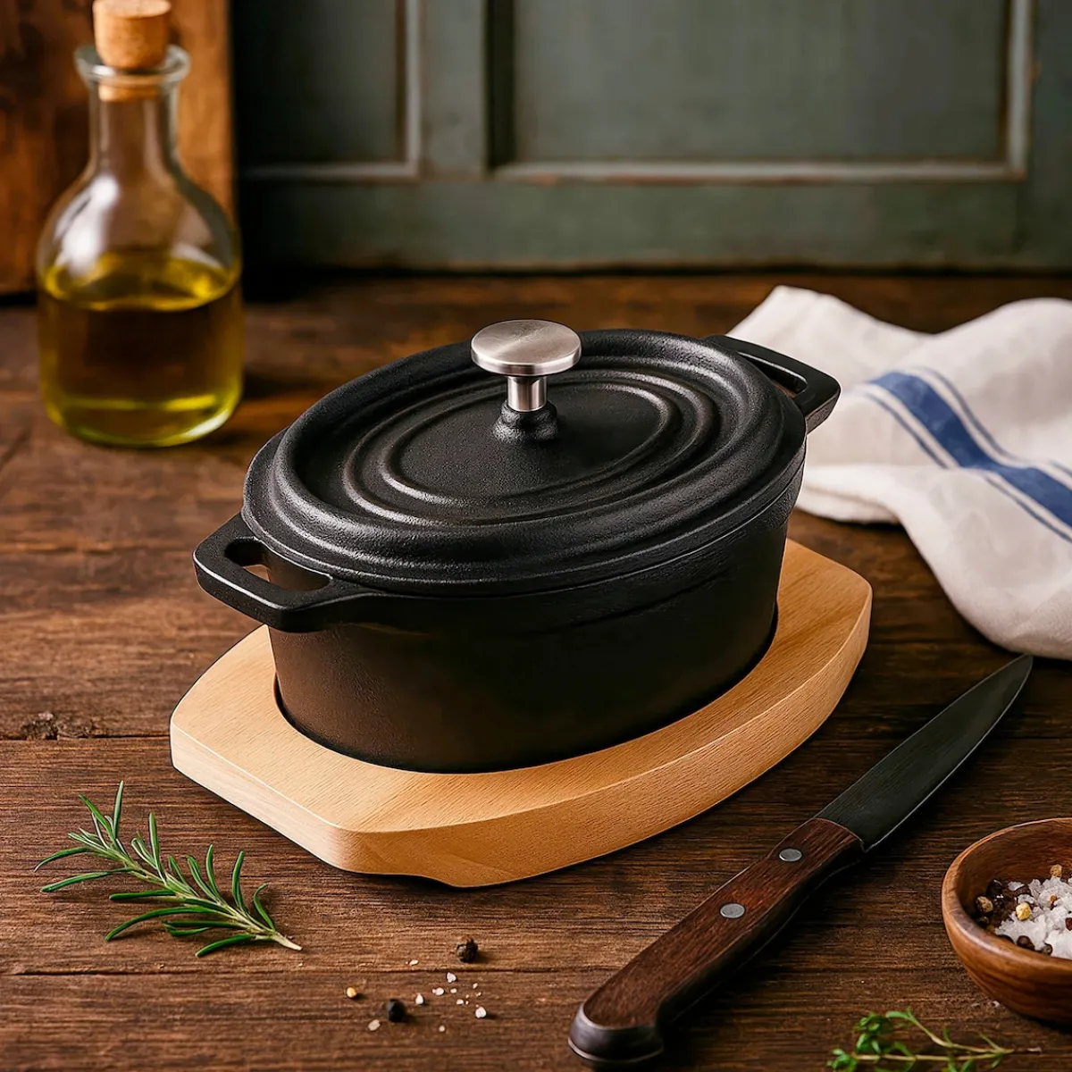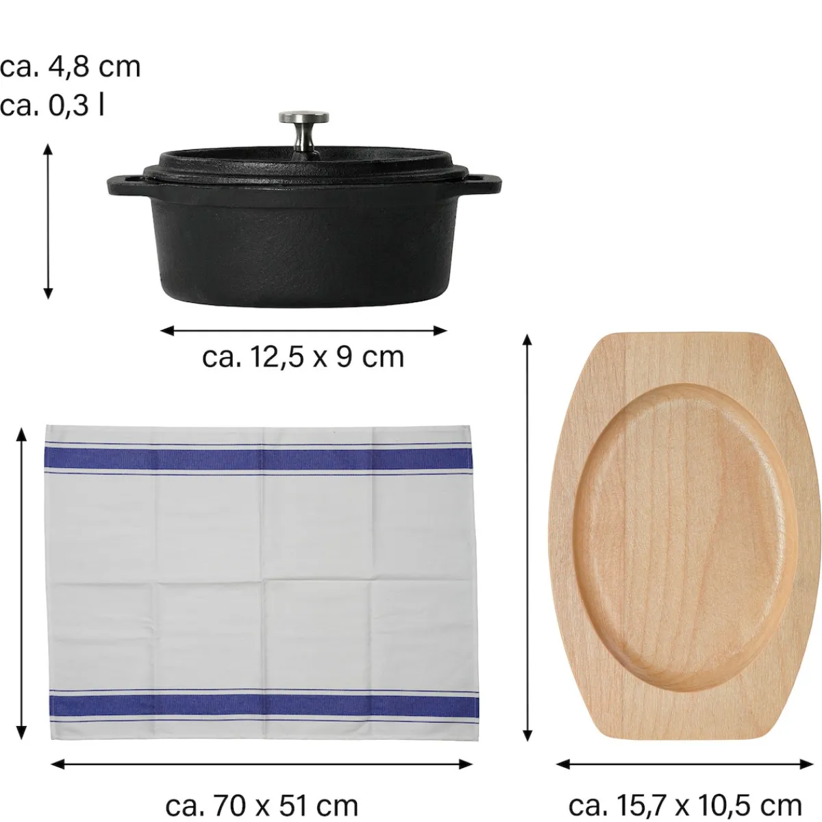 Pur! Echt! Rein! Das ist das Gusseisen Kochgeschirr von Freyersbacher Das handgeschmiedete Kochgeschirr aus emailliertem Gusseisen überzeugt durch seine einzigartigen Bratergebnisse, seine Pflegeleichtigkeit und seine exzellente Antihaftwirkung. Es eignet sich hervorragend für eine Vielzahl von Kochmethoden, vom Braten über Schmoren bis hin zum Backen. Die Freyersbacher Töpfe und Pfannen sind dank ihrem Emaille-Überzug wahre Alleskönner mit langer Lebensdauer und bei Profi- und Hobbyköchen gleichermaßen beliebt. Die Emaille-Beschichtung ist eine Art Glas, das durch das Schmelzen von Mineralien bei sehr hohen Temperaturen erzeugt wird. Die Emaille-Beschichtung schützt das Gusseisen vor Rost und bringt – im Gegenteil zu Töpfen und Pfannen aus reinem Gusseisen – eine einfache Pflege ohne Einbrennen mit sich. Außerdem reagiert die Beschichtung nicht mit säurehaltigen Lebensmitteln, so dass Sie alle Gerichte bedenkenlos zubereiten können. Die Emaillepfannen und Emailletöpfe garantieren einen langjährigen Genuss ohne Kompromisse! Da Gusseisen magnetische Eigenschaften besitzt, ist es für alle Herdarten geeignet und kann daher auch auf Herden mit Induktion verwendet werden. Das Material erwärmt sich rasch, ist äußert hitzebeständig und hält Temperaturen bis 400 °C stand. Gusseisenpfannen und -töpfe überzeugen durch eine hohe Wärmespeicherung, die das schnelle Abkühlen der Speisen verhindert. Dank der hohen Temperaturbeständigkeit sind die Töpfe und Pfannen auch für Holzbacköfen, offene Feuerstellen und Grills geeignet. Der handgeschmiedete Eisenkörper ist extrem robust und verzieht selbst bei hohen Temperaturen nicht. Wichtig für die richtige Nutzung von Gusseisenkochgeschirr ist es, die Pfanne oder den Topf stufenweise zu erhitzen. Ist die Pfanne oder der Topf rundum erwärmt, kann das Öl oder Fett zugegeben und die Temperatur je nach Zubereitungsart entsprechend erhöht werden. Ein Gusseisentopf eignet sich besonders für Schmorgerichte, zum Brotbacken, für Eintöpfe und für die Zubereitung klassischer Dutch Oven Rezepte. Die glatte, emaillierte Oberfläche ist sehr hygienisch, kratzfest und leicht zu reinigen. In den meisten Fällen genügt es, das Kochgeschirr mit einem Tuch auszuwischen. Als Hitzeschutz ist ein Tuch zum Greifen des heißen Kochgeschirrs sowie ein Brett aus Birkenholz im Lieferumfang enthalten. Der Holzuntersetzer ist perfekt auf die Größe der jeweiligen Pfanne oder des Topfes angepasst. Die Vertiefung im Untersetzer sorgt für einen sicheren Halt des Kochgeschirrs ohne zu Verrutschen. 1 Mini Cocotte Oval, ca. 12 x 8,5 cm, Höhe: ca. 4,8 cm, ca. 0,3 l 1 Deckel, ø ca. 12 x 8,5 cm 1 Holzuntersetzer 1 Baumwolltuch Die wichtigsten Vorteile auf einen Blick: Hochwertiges, handgeschmiedetes Gusseisen mit Emaille-Beschichtung Harte, kratzfeste und resistente Emaille-Beschichtung mit sehr langer Lebensdauer Ideal zum Kochen, Schmoren, Backen, Braten Inklusive Holzuntersetzer und Baumwolltuch als Hitzeschutz Leichte Reinigung dank Emaille-Beschichtung Extra starker, verzugsfreier Boden Bodenstärke: 3,4 mm Für alle Herdarten geeignet, auch Induktion; auch für Holzbacköfen, offene Feuerstellen und Grills geeignet Backofengeeignet bis 400 °C Material Topf und Deckel: Emailliertes Gusseisen; Holzuntersetzer: Birkenholz; Tuch: Baumwolle Tipps für Reinigung, Pflege und Handhabung: Vor dem ersten und nach jedem Gebrauch empfehlen wir, Ihr Gusseisen Kochgeschirr mit etwas Wasser und einem milden Spülmittel gründlich auszuwaschen. Achten Sie dabei darauf, dass der Artikel ausreichend abgekühlt ist, bevor Sie mit der Reinigung beginnen. Nicht mit kaltem Wasser abschrecken. Dank der Antihaftwirkung der Emaille-Beschichtung wird die Reinigung per Hand empfohlen. Das Freyersbacher Gusseisen Kochgeschirr wird nach dem Gießen nachbearbeitet und der Boden geglättet. Um empfindliche Oberflächen wie das Kochfeld dennoch zu schonen und vor möglichen Abnutzungen wie Kratzern zu schützen, ist es jedoch besser, die Töpfe und Pfannen vorsichtig hinzuste