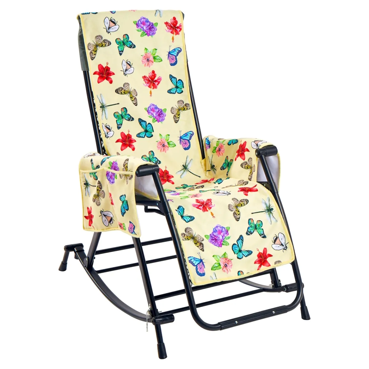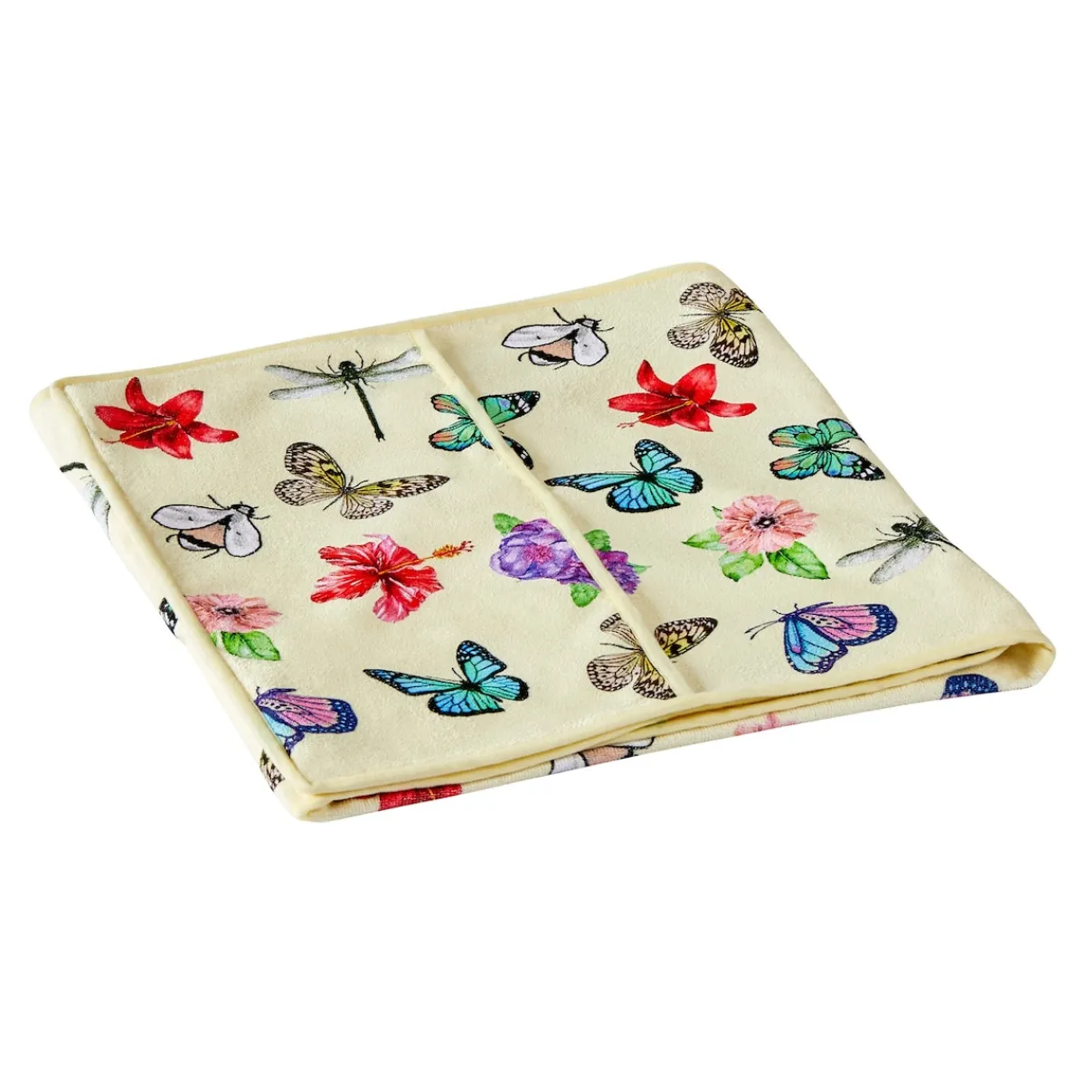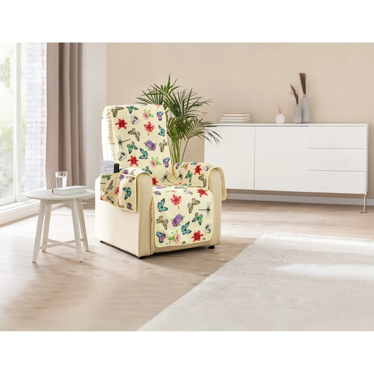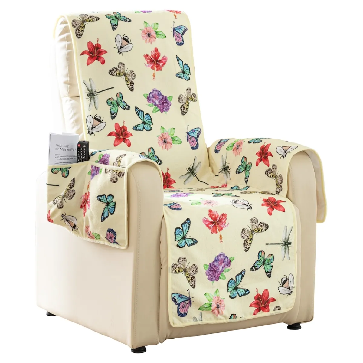 Da flattert doch glatt gute Laune in Ihr Wohnzimmer: Dieser traumhaft schöne Sesselschoner schützt Ihr Lieblingsmöbel vor Schmutz und schont das Polster. Gleichzeitig bietet er praktischen Stauraum und angenehmen Sitzkomfort. In den seitlichen Taschen ist ein Buch oder die Fernbedienung stets gut aufgeräumt und dennoch in greifbarer Nähe.