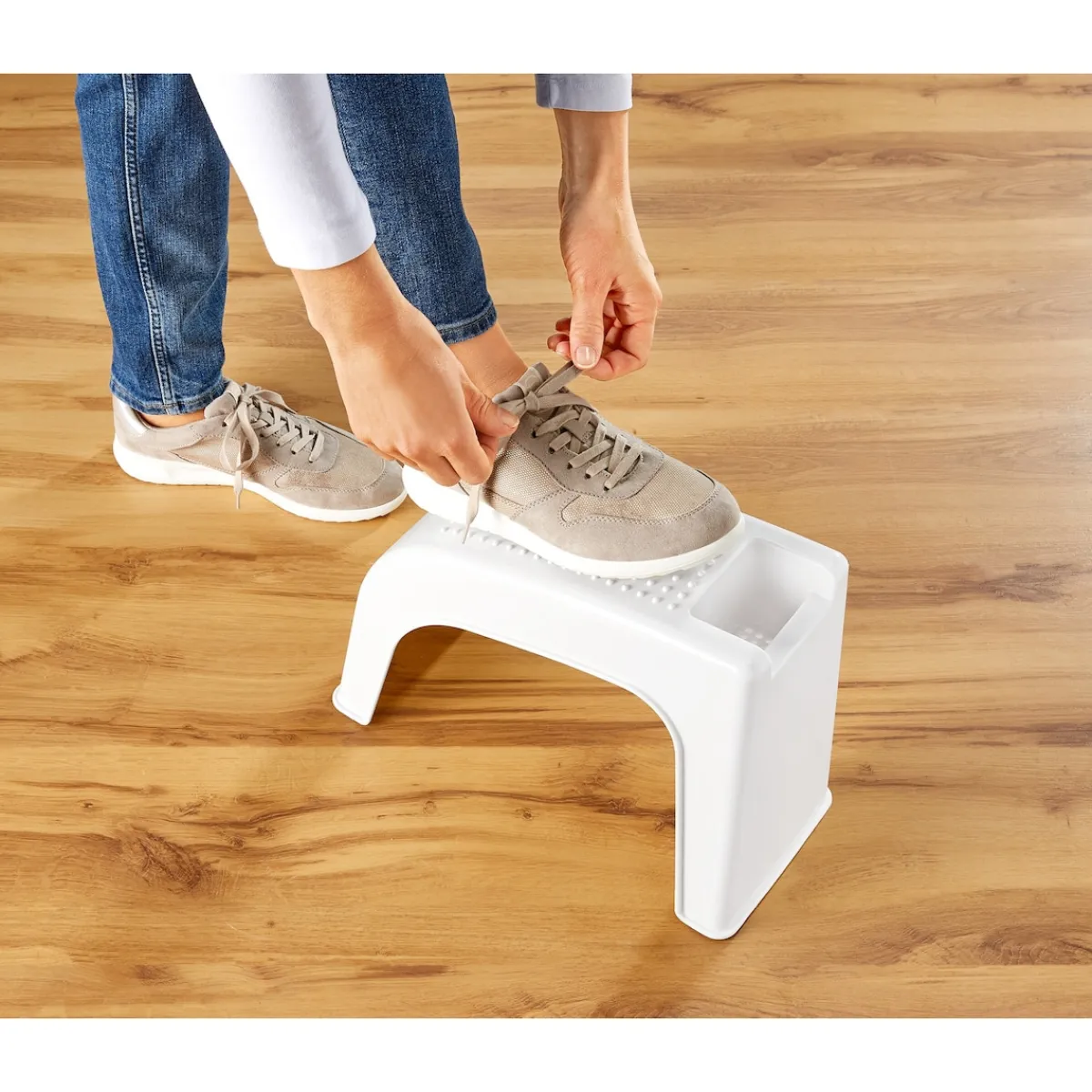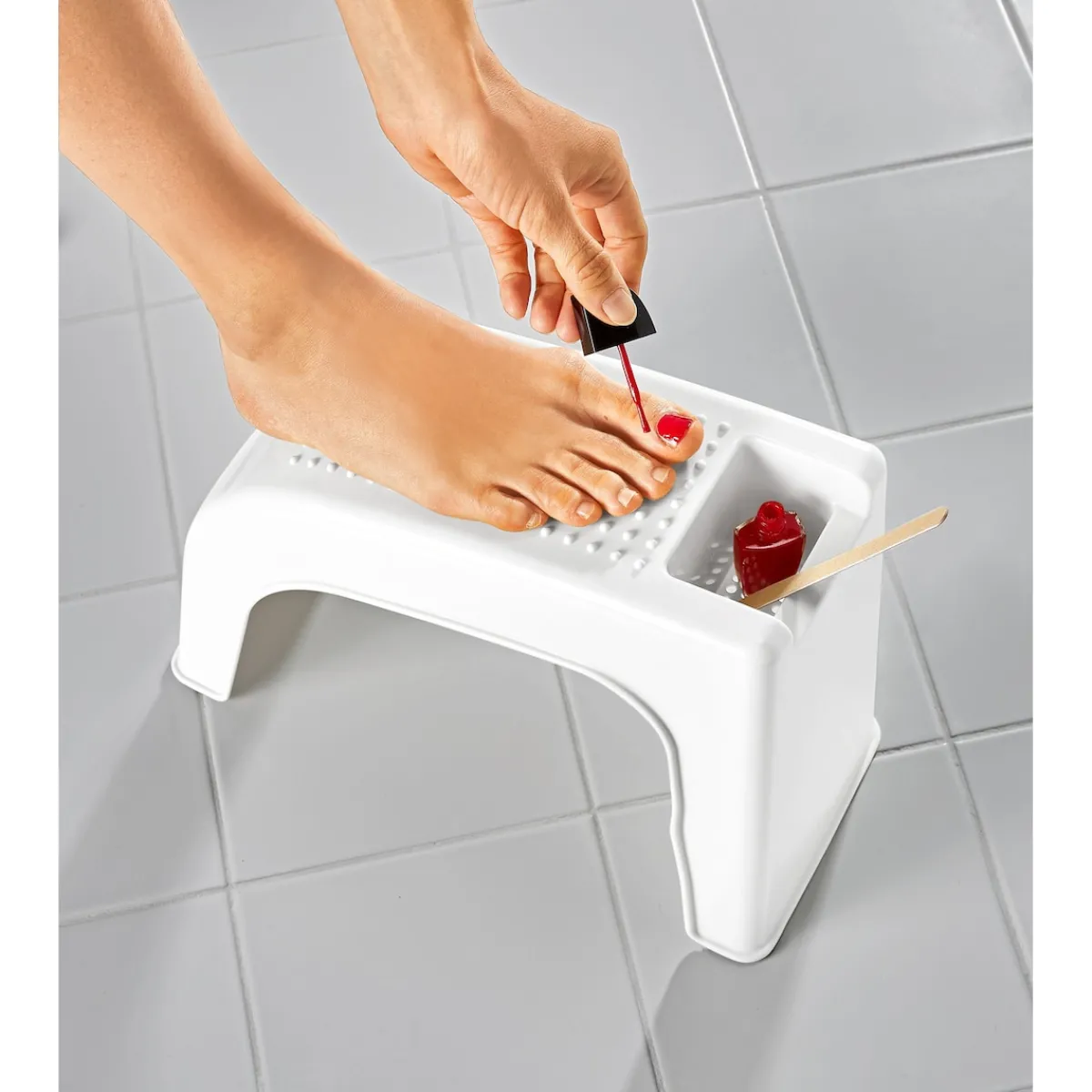 Diese Fußablage steht jederzeit unterstützend bereit – Sie müssen sich weniger bücken! Das macht die tägliche Fußpflege viel komfortabler – ideal zum Schuhe Anziehen und zum Schneiden oder Lackieren von Fußnägeln. Mit Anti-Rutsch-Oberfläche.