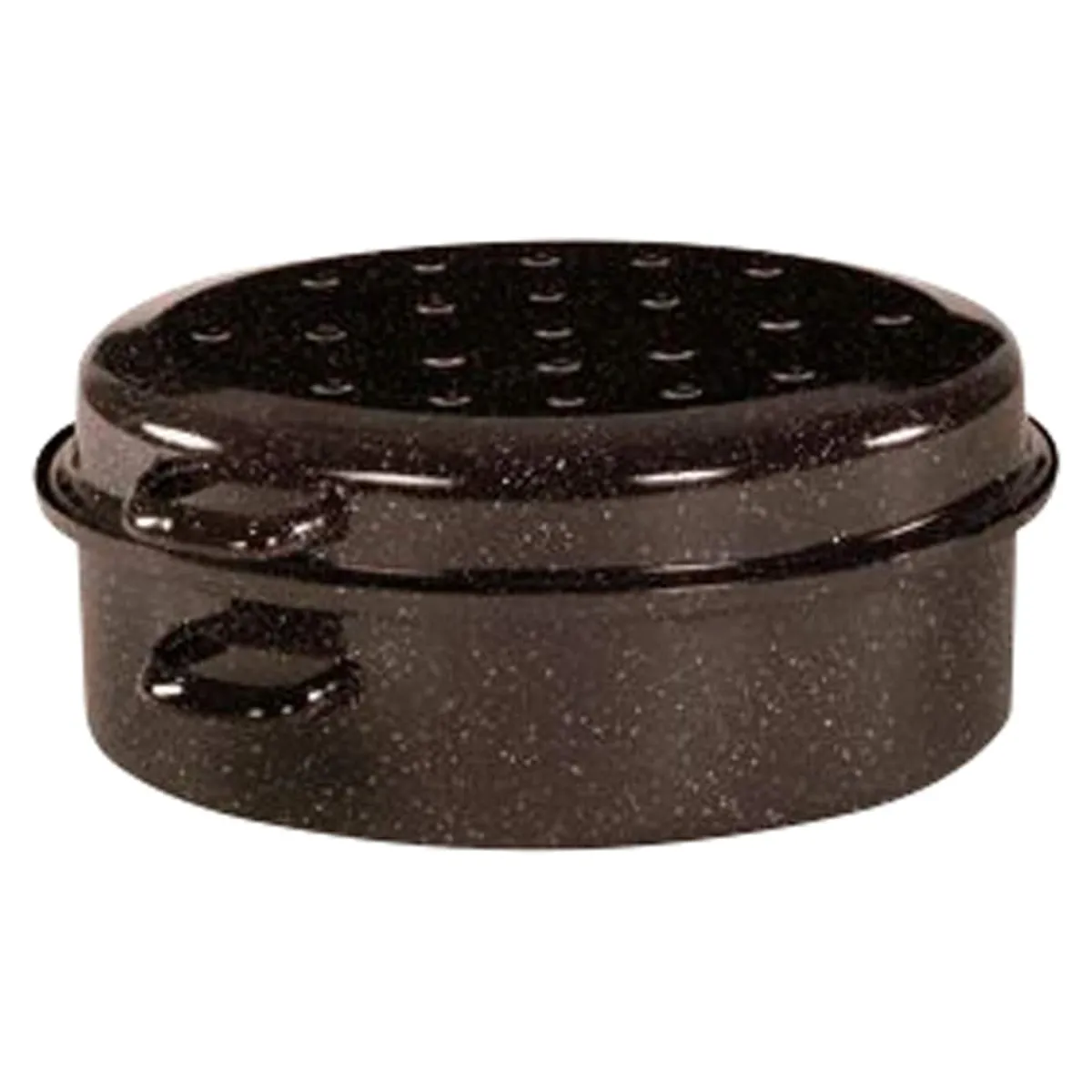Emaillierter Gansbräter mit Topfdeckel schwarz-weiß gesprenkelt. 34 cm, Inhalt ca. 5 Liter. Durch die Tropfpunkte im Deckel sammeln sich die Gardünste und verteilen sich gleichmäßig über das Bratgut.