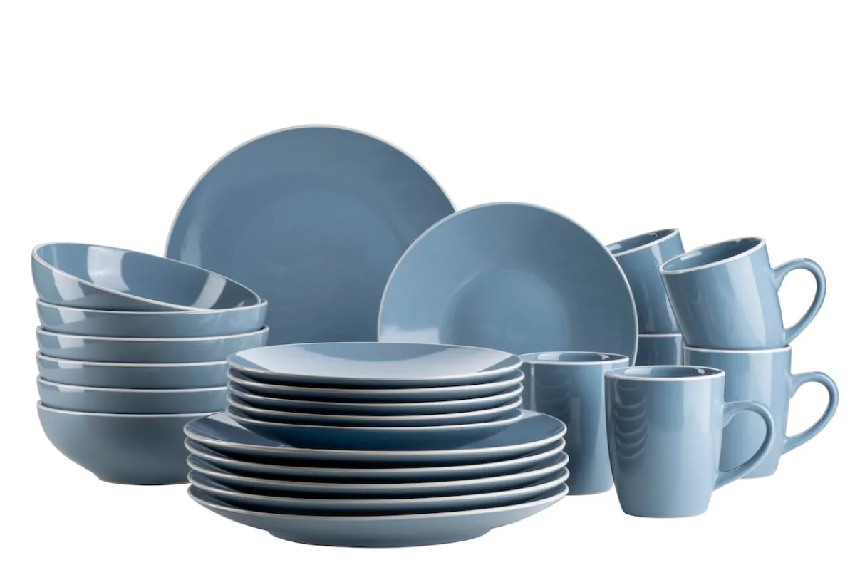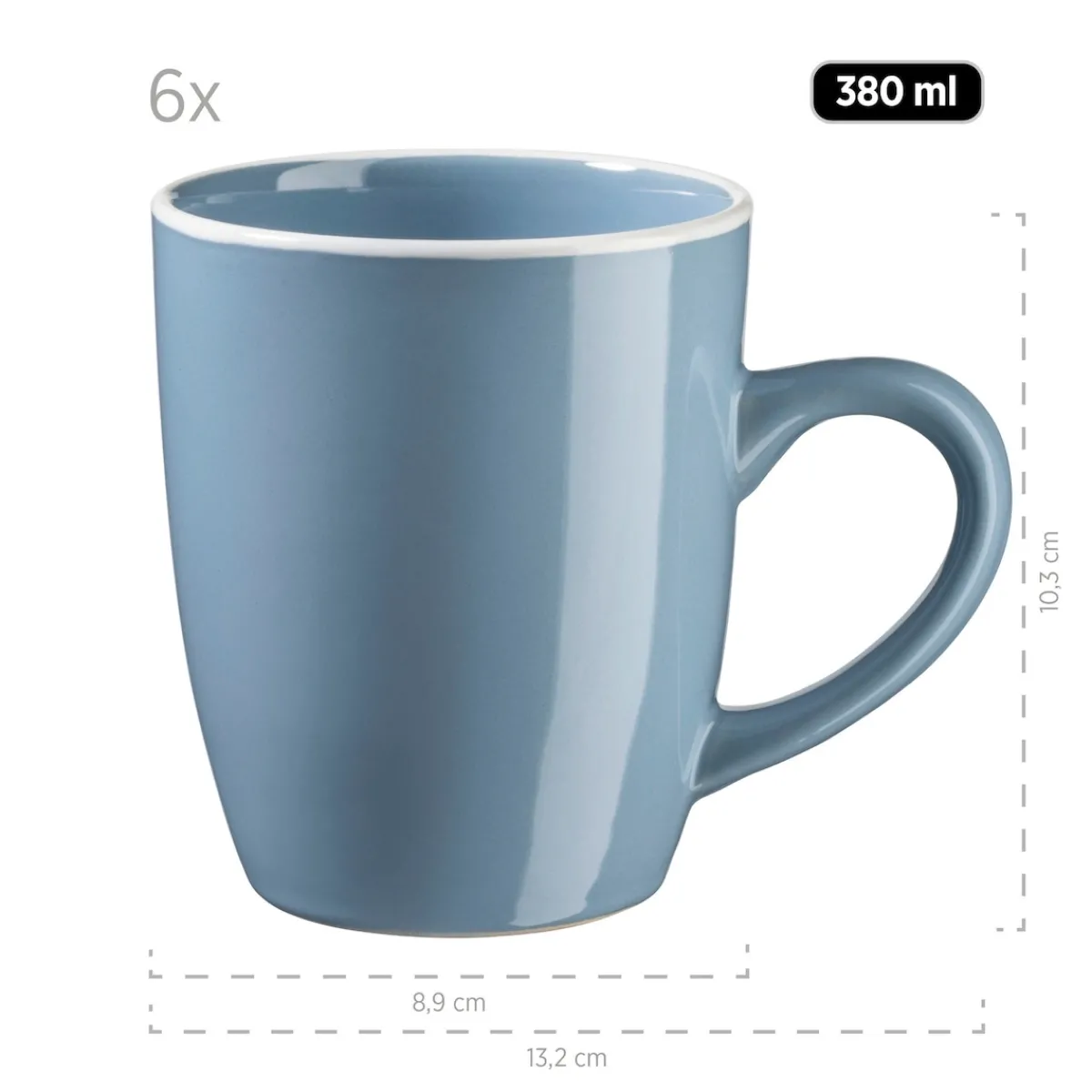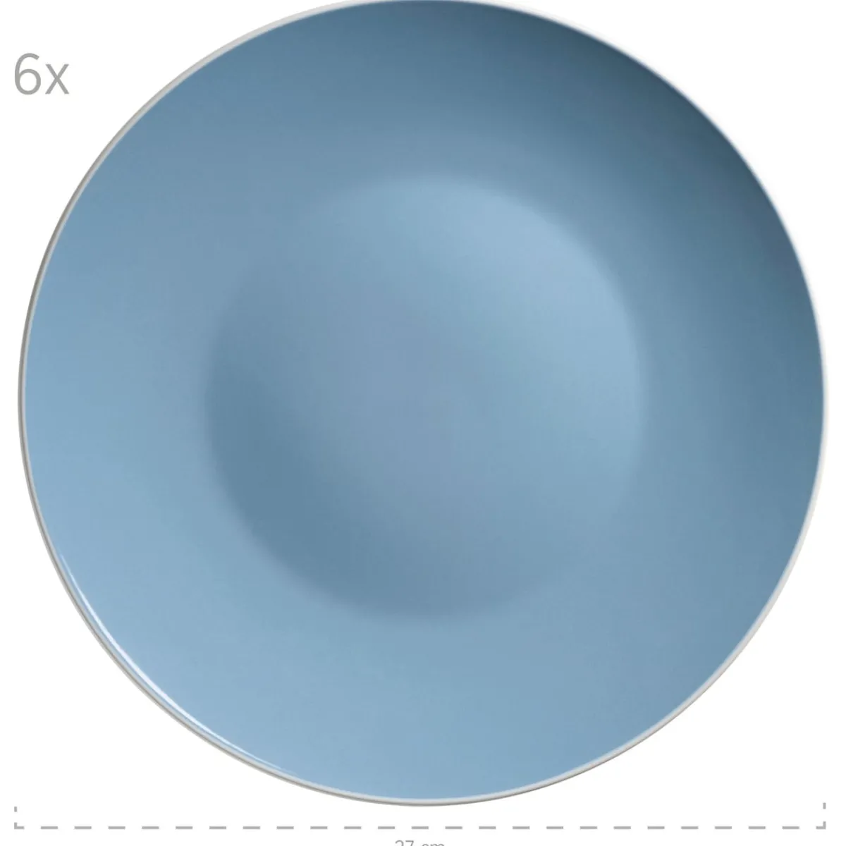 Dieses moderne und freundliche Geschirrset für 6 Personen umfasst 6 flache Speiseteller (Ø 27 cm), 6 Dessertteller (Ø 21 cm), 6 großzügige Müslischalen bzw. Suppenschalen (Ø 18,5 cm, 800 ml Füllmenge) und 6 Kaffeebecher (380 ml)