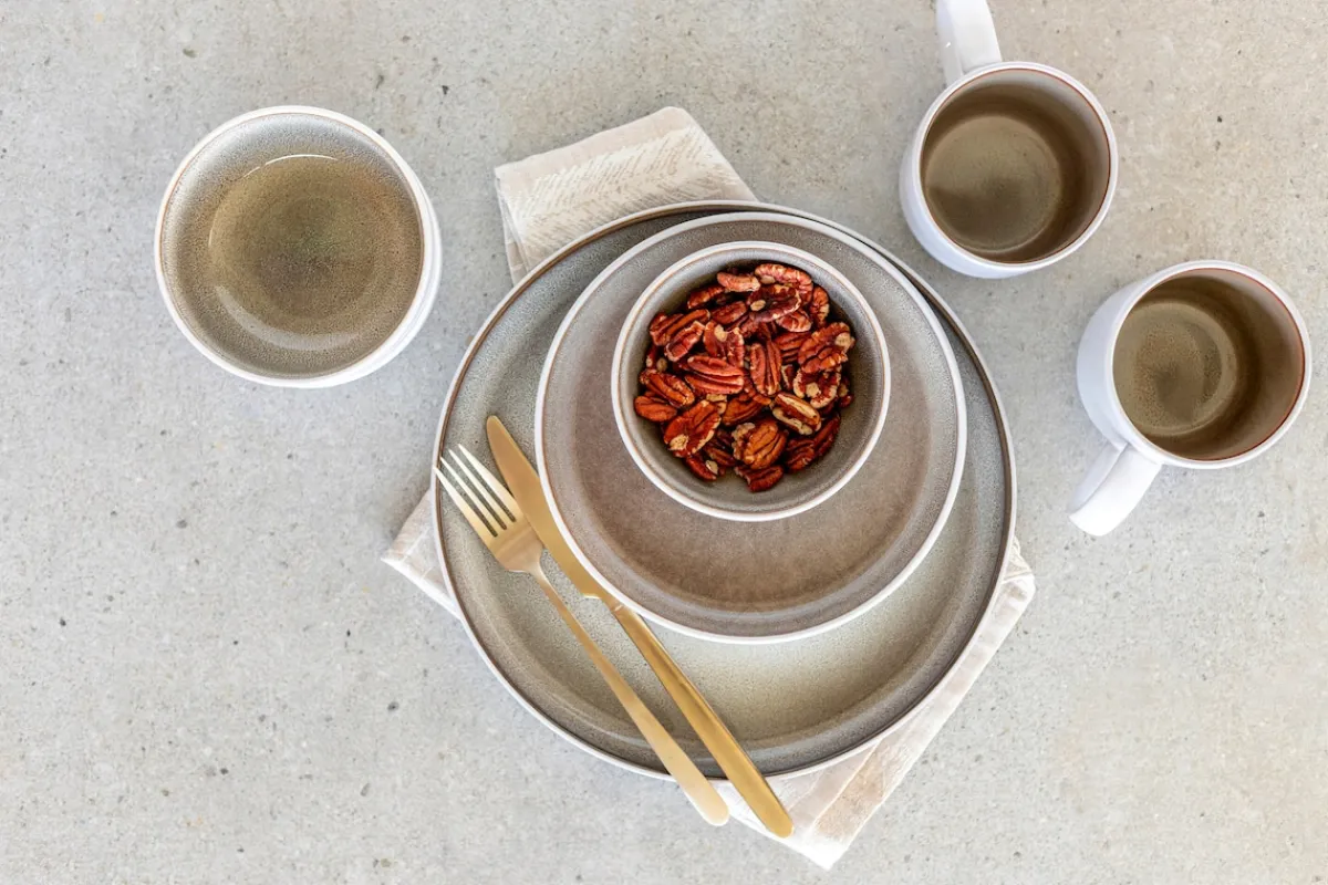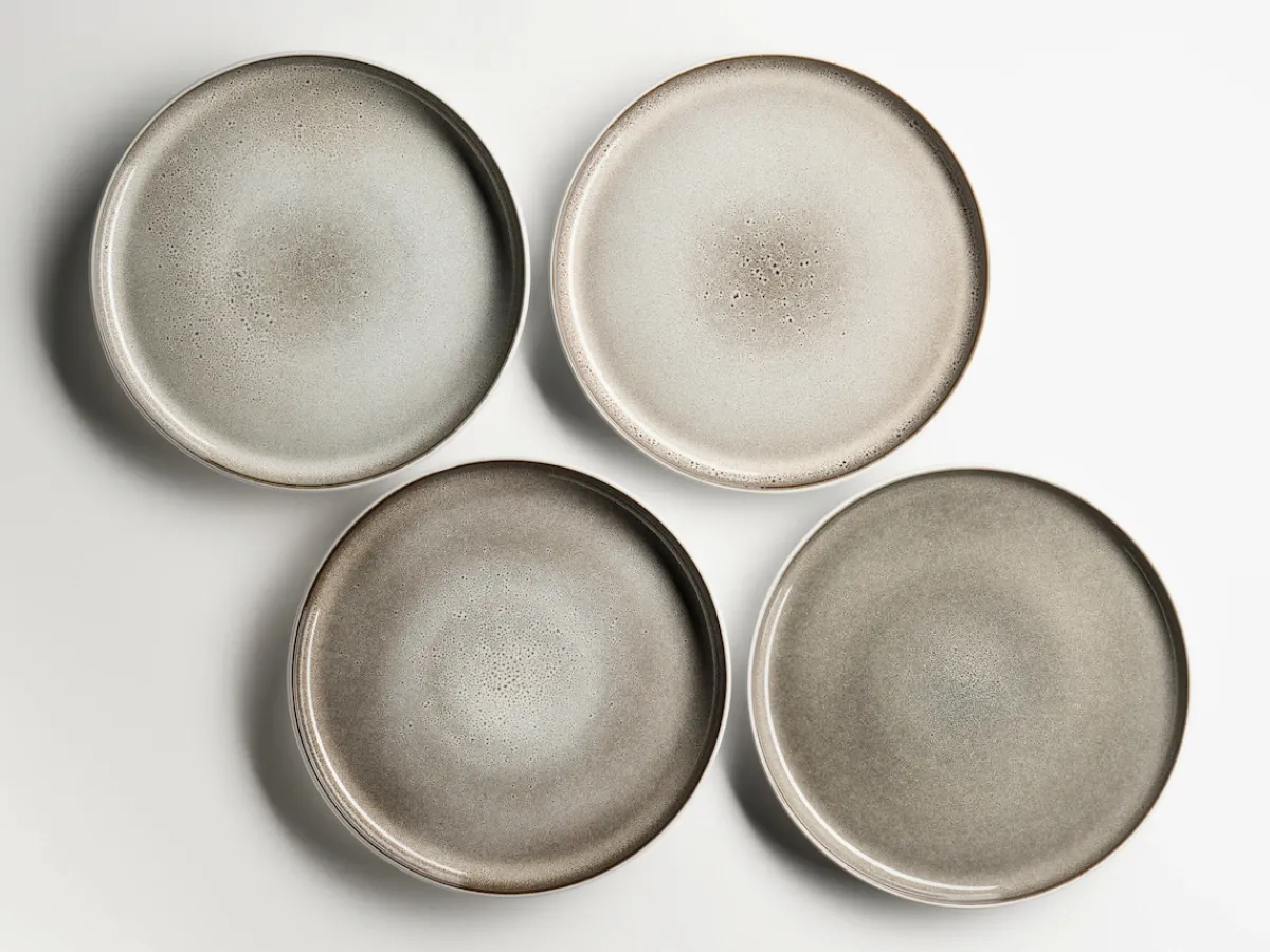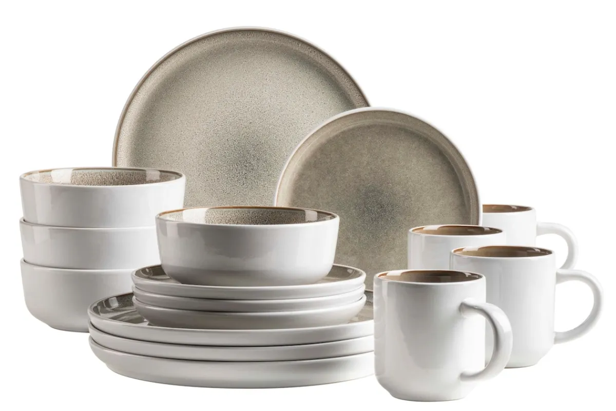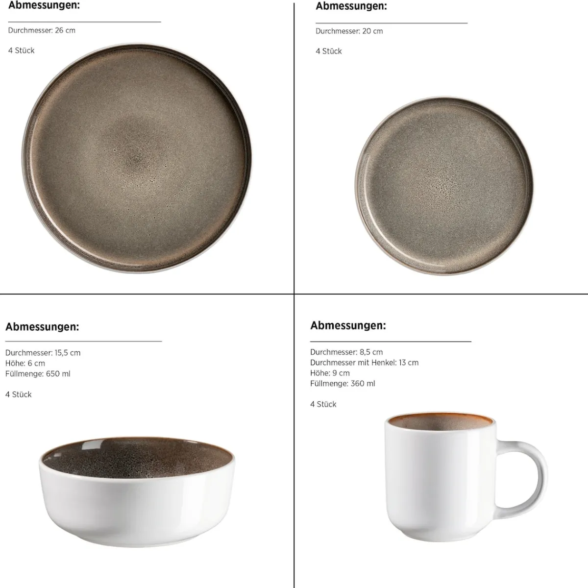 Harmonische Keramikformen und Reaktivglasuren mit einzigartigem Farbverlauf: Die GeschirrSerie „Lunaria“ der Marke MÄSER vereint alles, was man von einem modernen Geschirrservice erwartet. Das robuste, pflegeleichte Steinzeug Material lässt sich in der Spülmaschine reinigen und in der Mikrowelle verwenden. Eine unifarbene Außenseite im hellen Cremeton wird kombiniert mit einer visuellen, glänzenden Reaktivglasur. Diese besondere Reactive Glaze Glasurtechnik verhält sich während des Vorgangs im Brennofen individuell – jedes Teil entwickelt dabei seine ganz persönliche Farbgebung und Musterung. Dadurch ist jedes Stück ein echtes Unikat mit Charakter. Die Geschirr Kollektion „Lunaria“ umfasst Speiseteller (Ø 26 cm), tiefe Teller (Ø 18 cm), Dessertteller (Ø 20 cm), Schüssel mit Ø 15,5 cm sowie Kaffeebecher mit 360 ml Füllmenge. Zur besseren objektiven Vergleichbarkeit gehen unsere Füllmengenangaben von einer randvollen Befüllung aus.