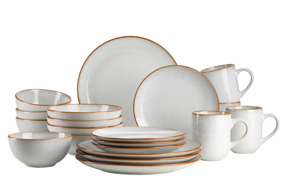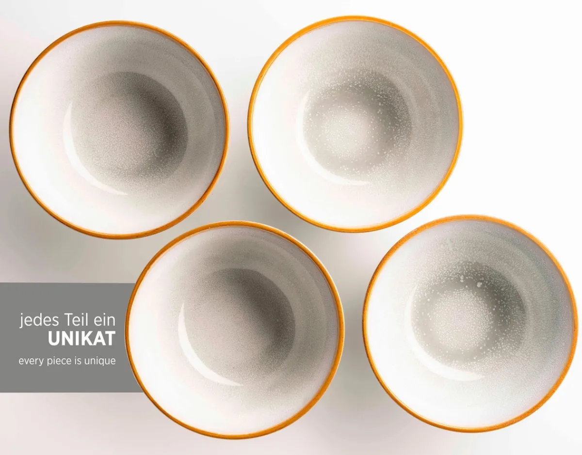 Alle Teile aus dem Kombiservice zeichnet eine weiche, runde Form aus, die das Farbspiel der Naturtöne in der Reaktivglasur besonders gut zur Geltung bringen.