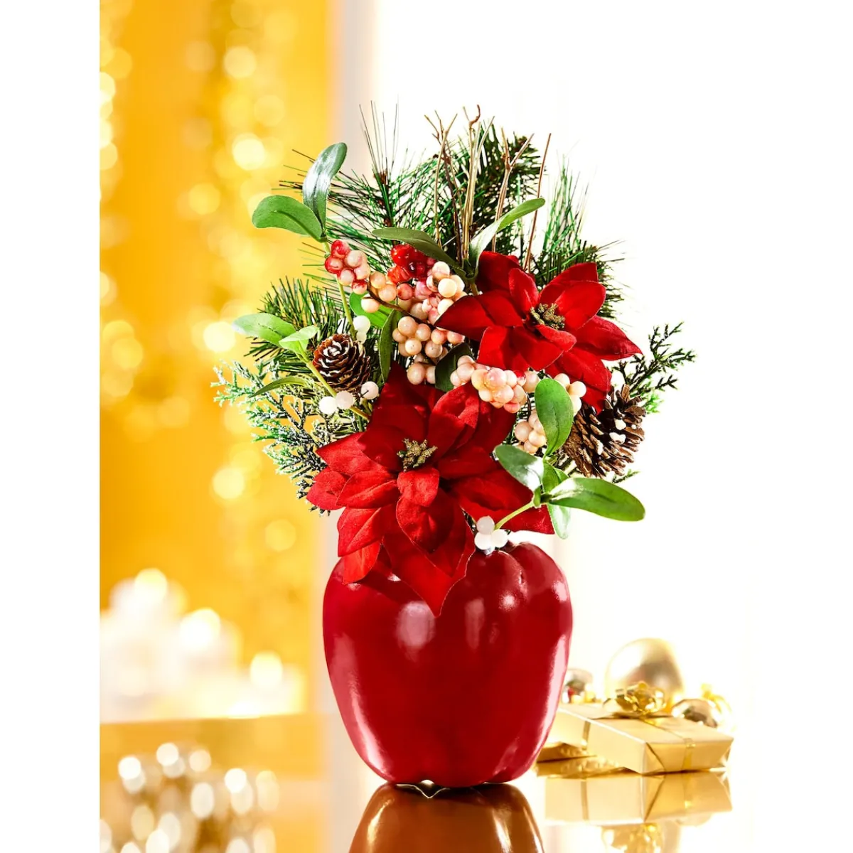 Was für ein natürlich wirkendes Gesteck! Einfach wunderschön – und sooo pflegeleicht! Perfekt auch für Stellen, an denen zu wenig Licht für eine echte Pflanze hinfällt! Pflegeleicht und farbecht. Das Gesteck ist zusätzlich mit Kunstbeeren und -tannenzapfen geschmückt. Topf in Form eines Apfels.