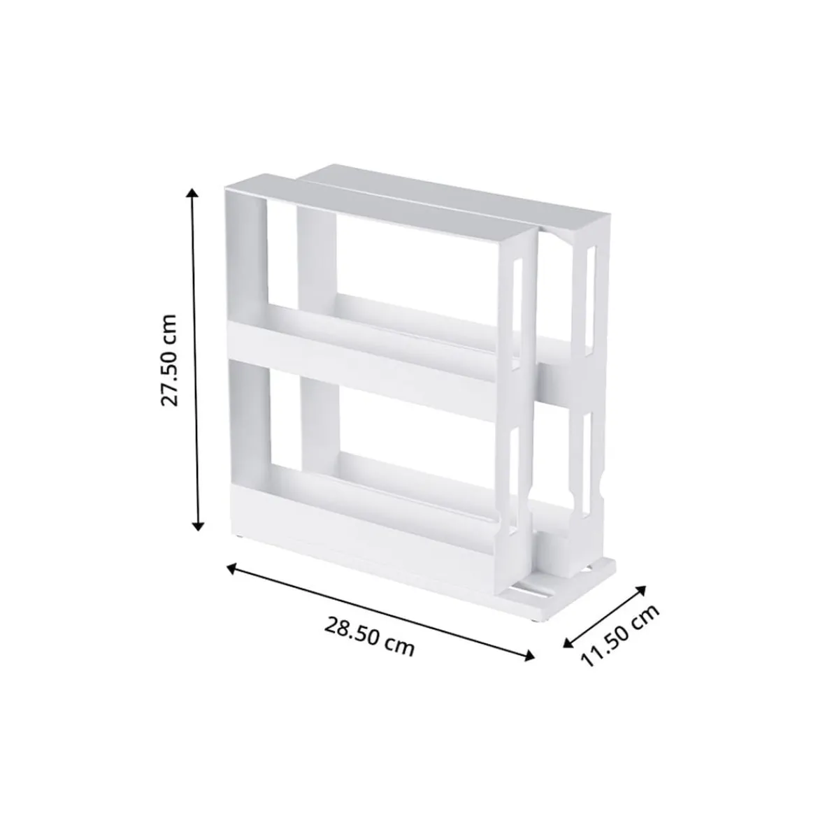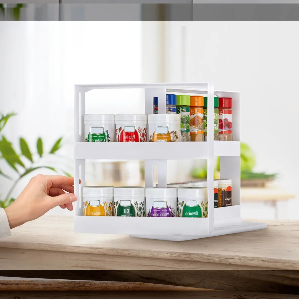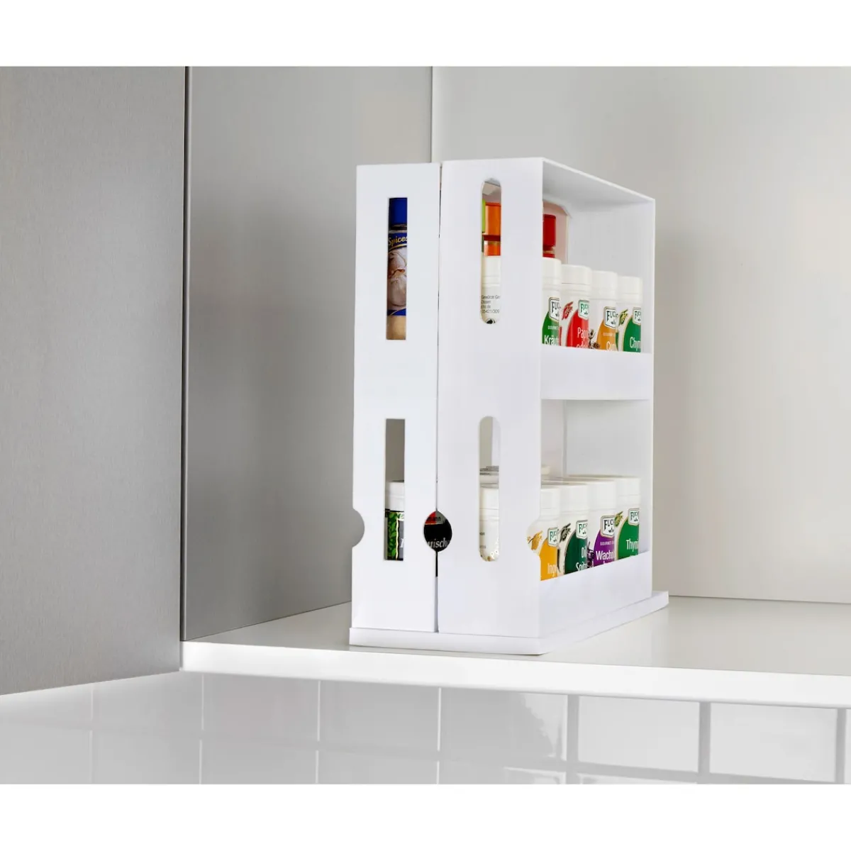 Dieses praktische Regal bietet Platz für all Ihre Gewürzdosen und sorgt so für Ordnung in Ihrer Küche. Die ausziehbaren Fächer maximieren den Stauraum und ermöglichen eine übersichtliche Anordnung Ihrer Gewürze.