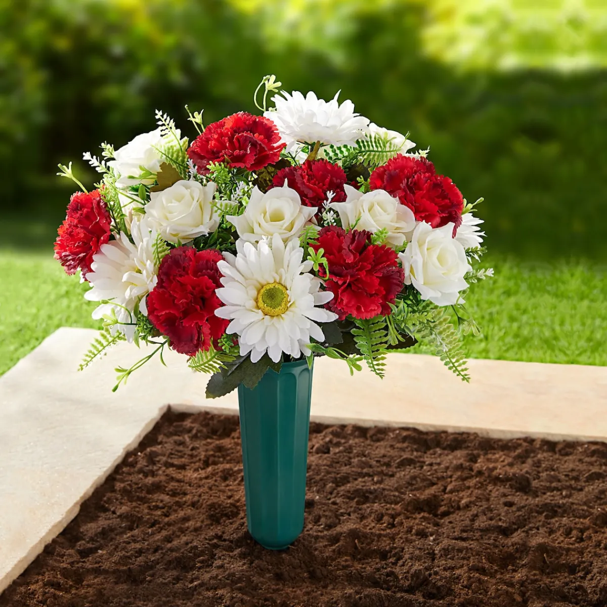 Eine Vase einfach in die Erde stecken, mit dem herrlichen Grabstrauß bestücken – und schon schmückt ein nie ver welkender Blumengruß das Grab Ihrer Lieben.
