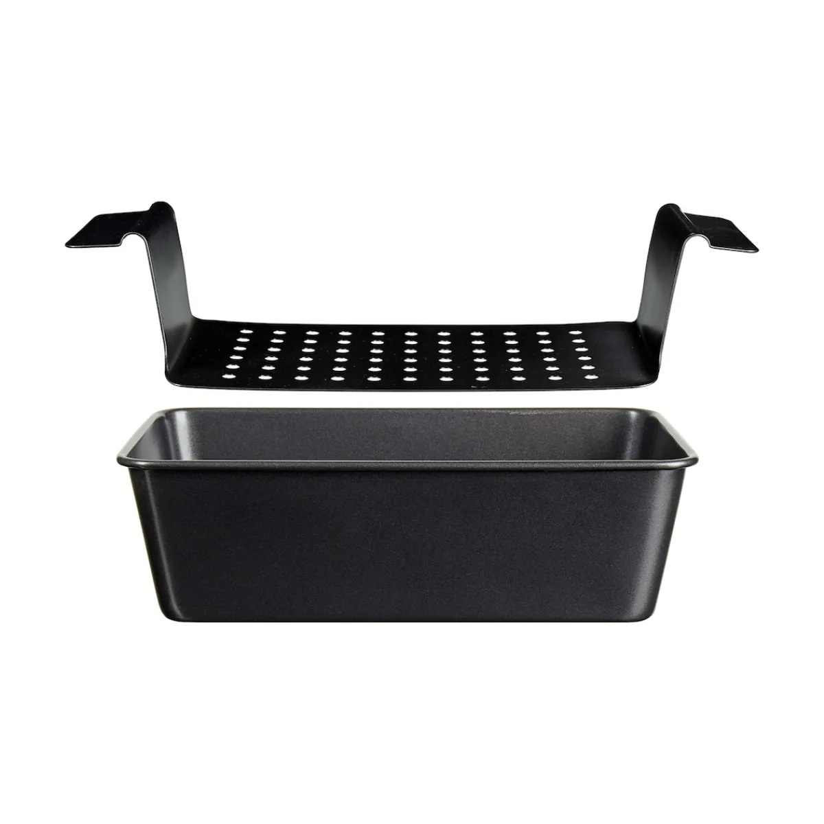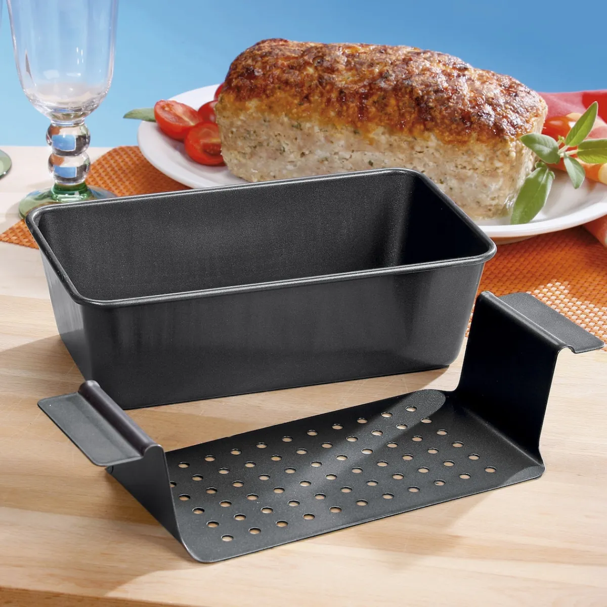 Einfach Ihr Lieblings-Hackbratenrezept zubereiten, in die gefettete Form geben und ab damit in den Ofen – Sie werden begeistert sein. Durch den herausnehmbaren Einsatz ohne Seitenteile ist die Entnahme aus der Form und das Aufschneiden ein Kinderspiel. Außerdem bleibt überschüssiges Fett durch Löcher im Boden des Einsatzes in der Form zurück. Material: Antihaftbeschichtetes Metall. Maße: ca. 25 x 14,5 x 7,5 cm. Hitzebeständig bis 200°C.