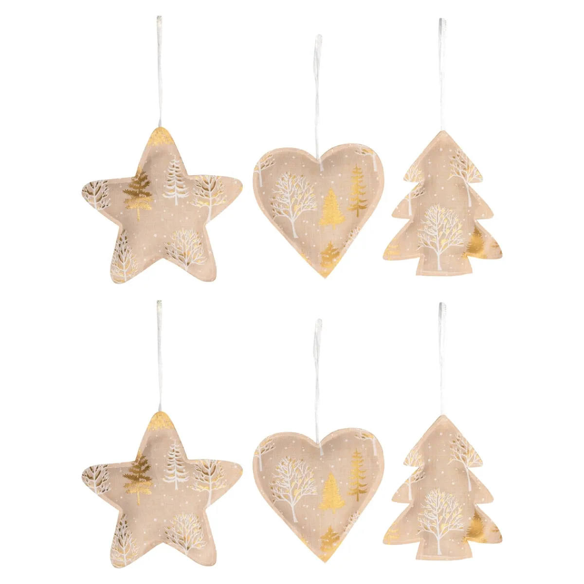 Textiler Baumschmuck in Bestform: Der mit Goldapplikationen glänzende Motivstoff dieser liebevoll genähten Anhänger bringt ganz mühelos festliche Stimmung an Fenster, Türen oder den Weihnachtsbaum. Einfach am Schmuckband aufhängen.