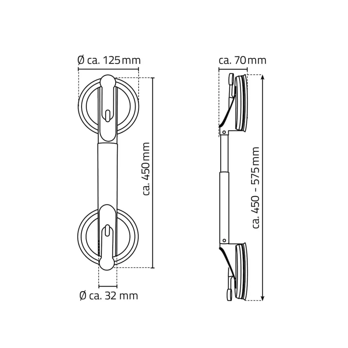 Abmessungen: Saugteller-Ø: 12,5 cm, ausziehbar: 45-57,5 cm, Länge Grifffläche: 21-33,5 cm