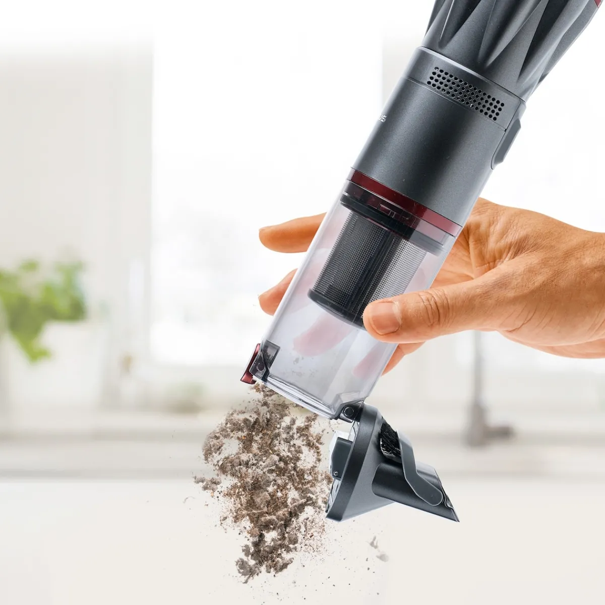 Ist der Staubbehälter gefüllt, lässt er sich ganz bequem und hygienisch per Knopfdruck entleeren, ohne mit dem eingesaugten Staub und Schmutz in Berührung zu kommen. Nach Gebrauch wird der Staubsauger einfach auf die Ladestation gestellt, wo er sich platzsparend aufbewahren lässt und zugleich für seinen nächsten Einsatz aufgeladen wird. Der Lithium-Ionen-Akku ist innerhalb von drei bis vier Stunden vollständig aufgeladen und bietet dann für bis zu 16 Minuten maximale Saugkraft.