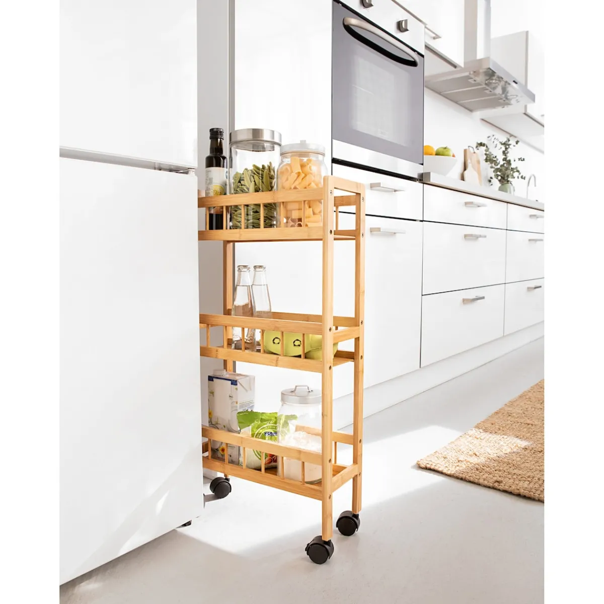 Das stabile Bambusdesign verleiht dem Rollwagen nicht nur eine natürliche Optik, sondern sorgt auch für eine hohe Tragfähigkeit. Dieser Wagen trägt nicht nur zur Ordnung in Ihrer Küche bei, sondern kann auch im Badezimmer oder anderen Räumen flexibel eingesetzt werden.
