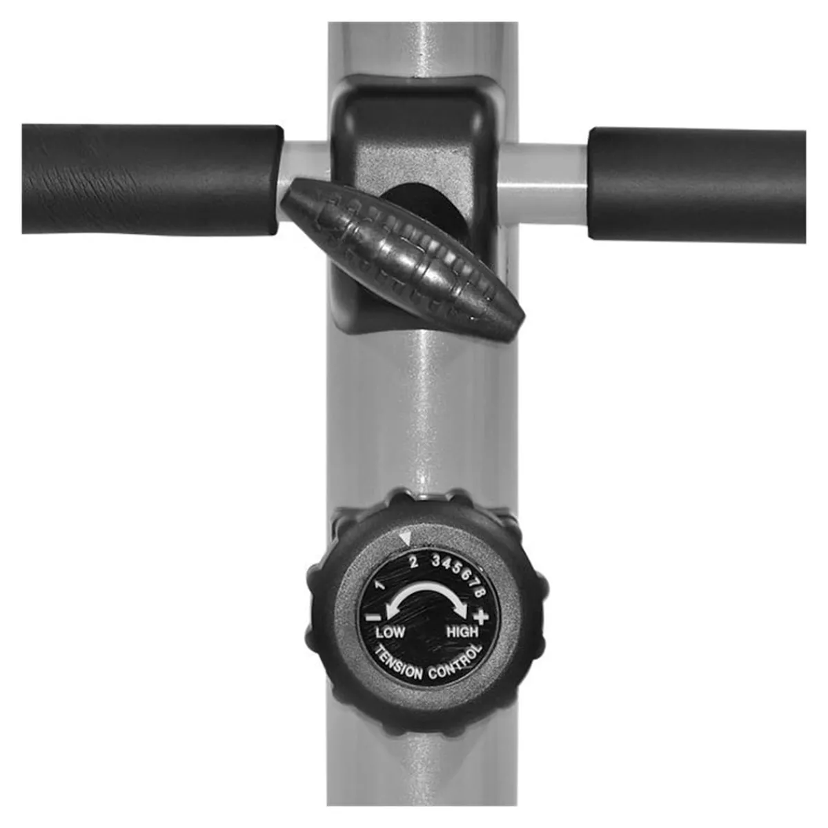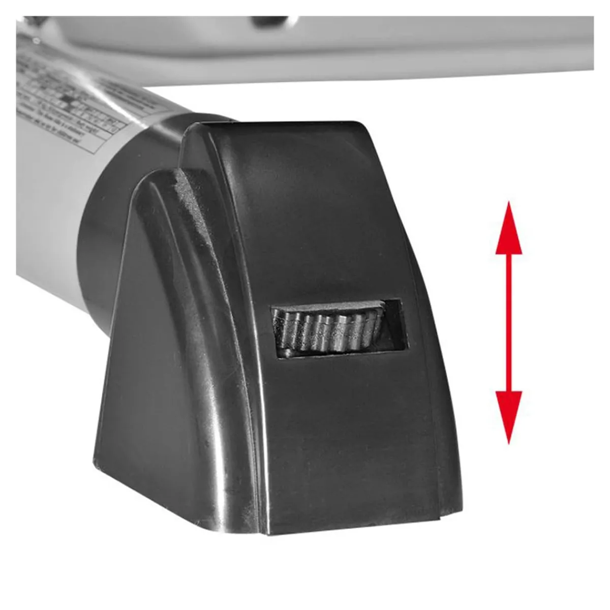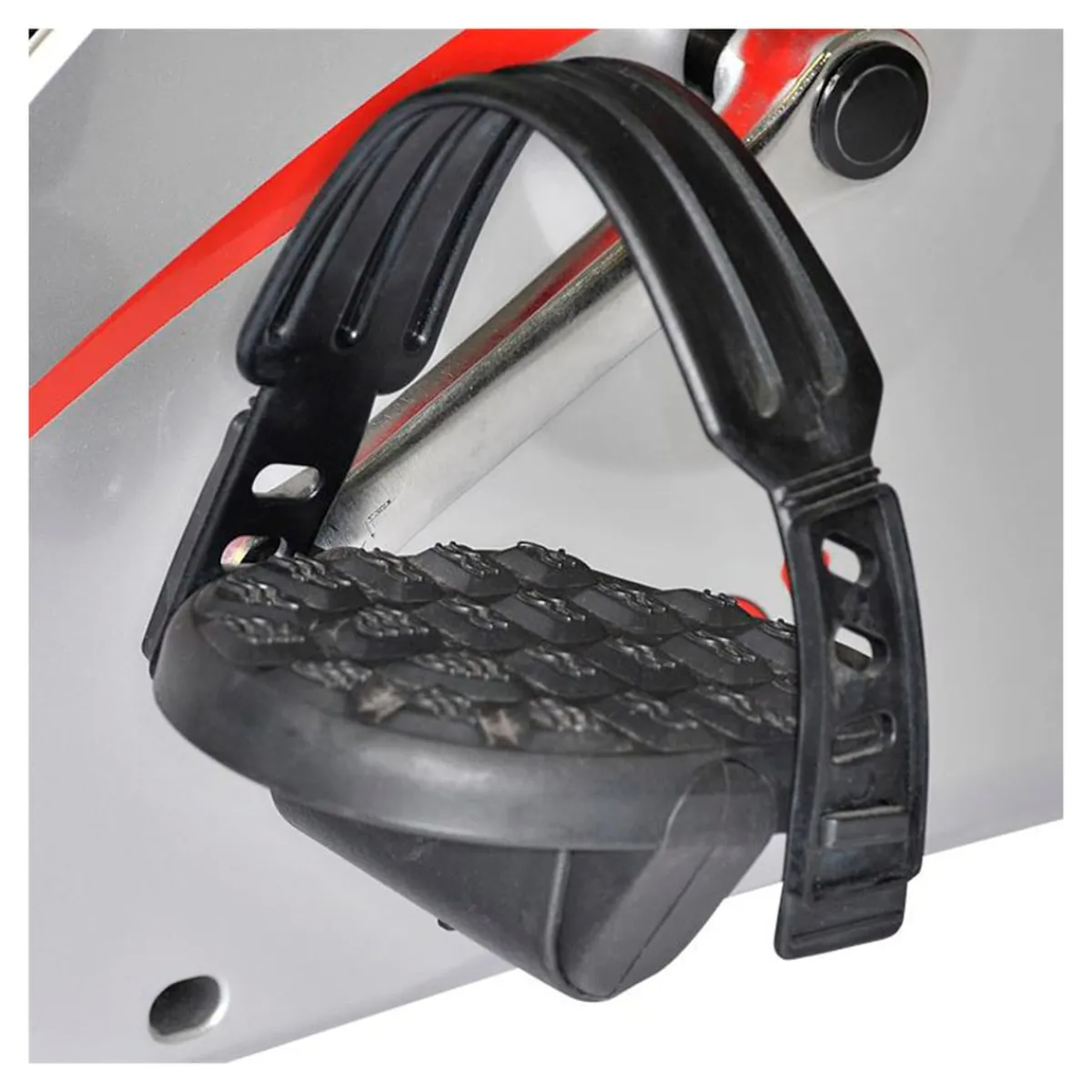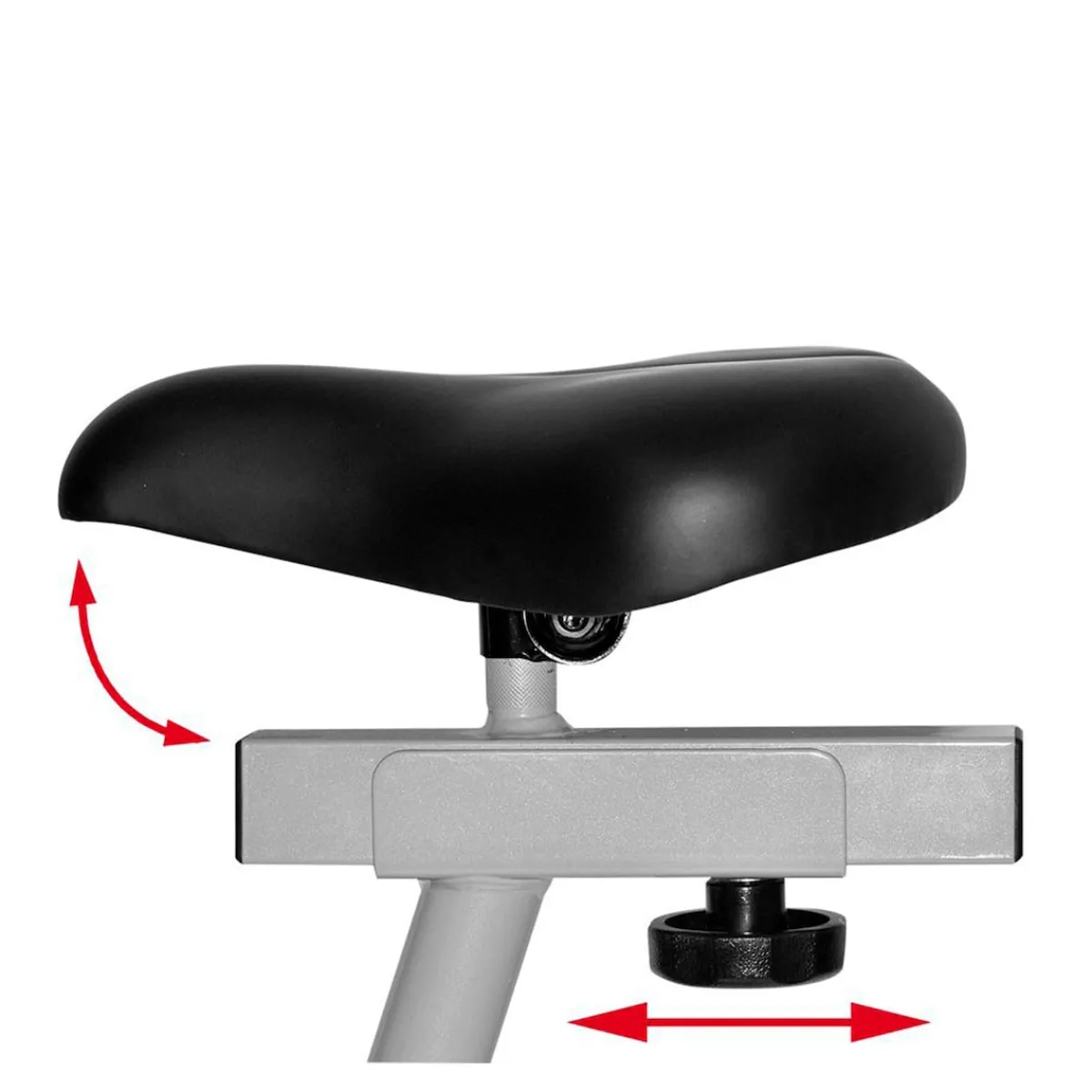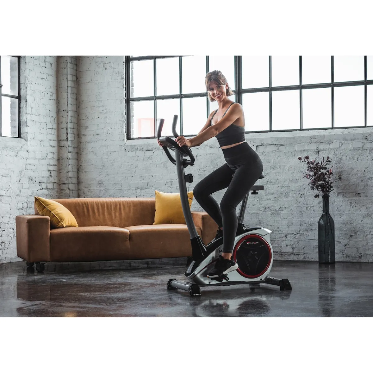 Der stabile Heimtrainer ist mit einem verschleißfreiem Magnet-Brems-System und flüsterleisem Flachriemenantrieb ausgestattet um ein geräuscharmes Training mit sehr gutem Rundlaufverhalten zu ermöglichen. LCD-Display ermöglicht 2 Anzeigewerte auf einen Blick und lässt sich mit den Tasten durch einfaches Berühren leicht bedienen. Handpulssensoren im Lenker für eine gezielte Überwachung während der Trainingseinheiten. Sattel kann vertikal oder horizontal verstellt werden. Durch die vordere Transportrolle ist ein einfaches Wechseln des Standorts garantiert. Max. bis 150 kg belastbar.