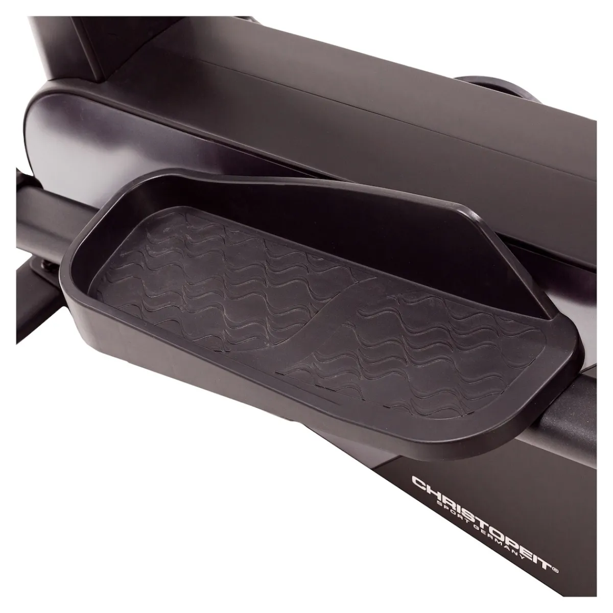 Die vorderen Transportrollen erleichtern den Standortwechsel des Ergometers, und die höhenverstellbaren Fußkappen sorgen für einen sicheren Stand des Geräts.