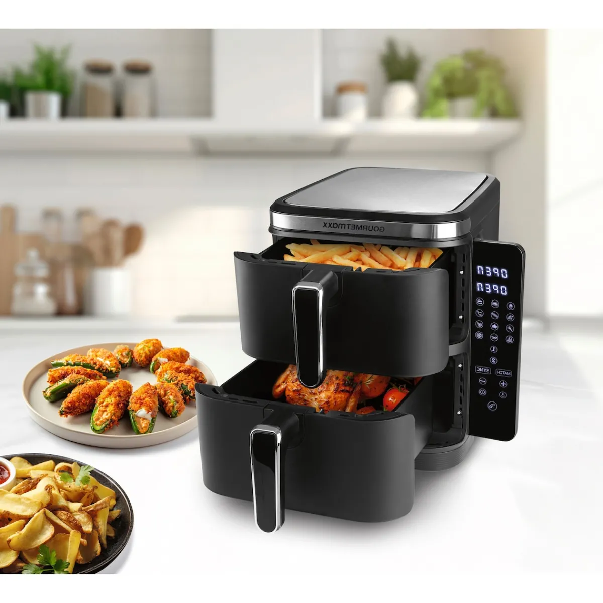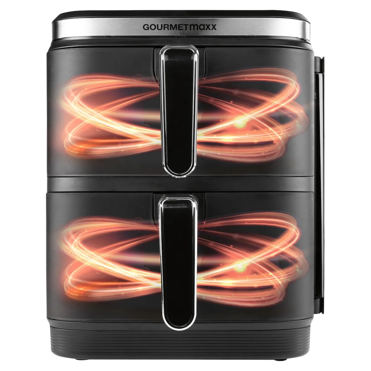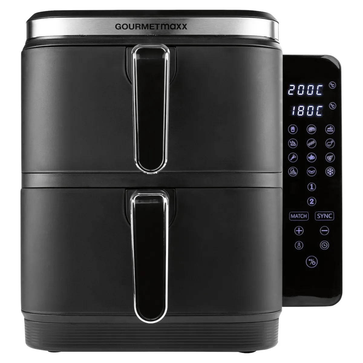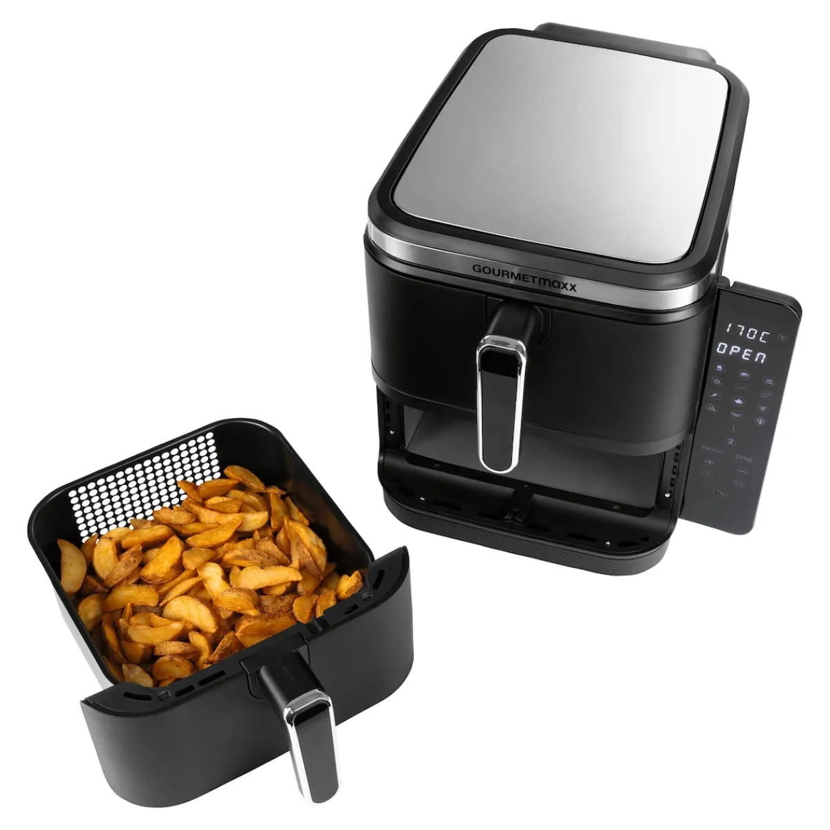 Der Alleskönner für gesundes Kochen mit Genuss-Garantie! Diese kompakte Doppelkammer-Heißluftfritteuse mit einer Kapazität von 10 l vereint Ofen, Fritteuse und Grill in nur einem Gerät. Ob knusprige Pommes und zartes Hähnchen oder Gemüse und Fisch – bereiten Sie 2 Speisen gleichzeitig zu, ganz ohne Geruchsbelästigung und mit deutlich weniger Fett.