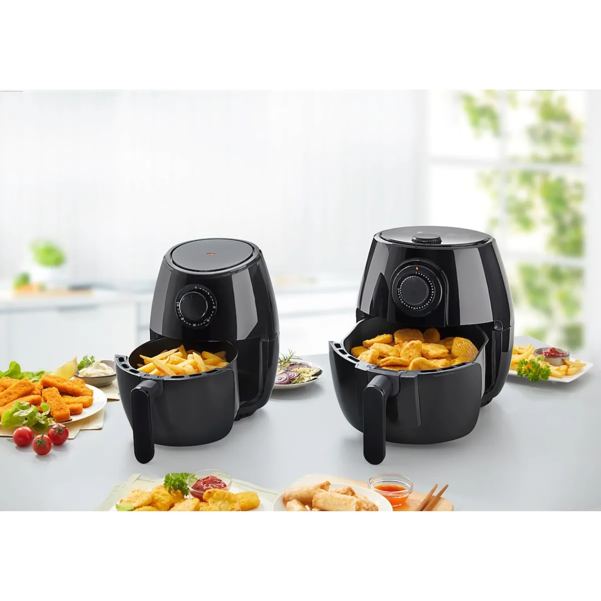 Die Heißluftfritteuse ist in zwei Varianten erhältlich: Für Single- oder 2-Personen-Haushalte reicht die kleinere Variante „Single“ aus. In größeren Haushalten mit 4-6 Personen braucht es ein größeres Volumen, wie es die XXL-Variante mitbringt.