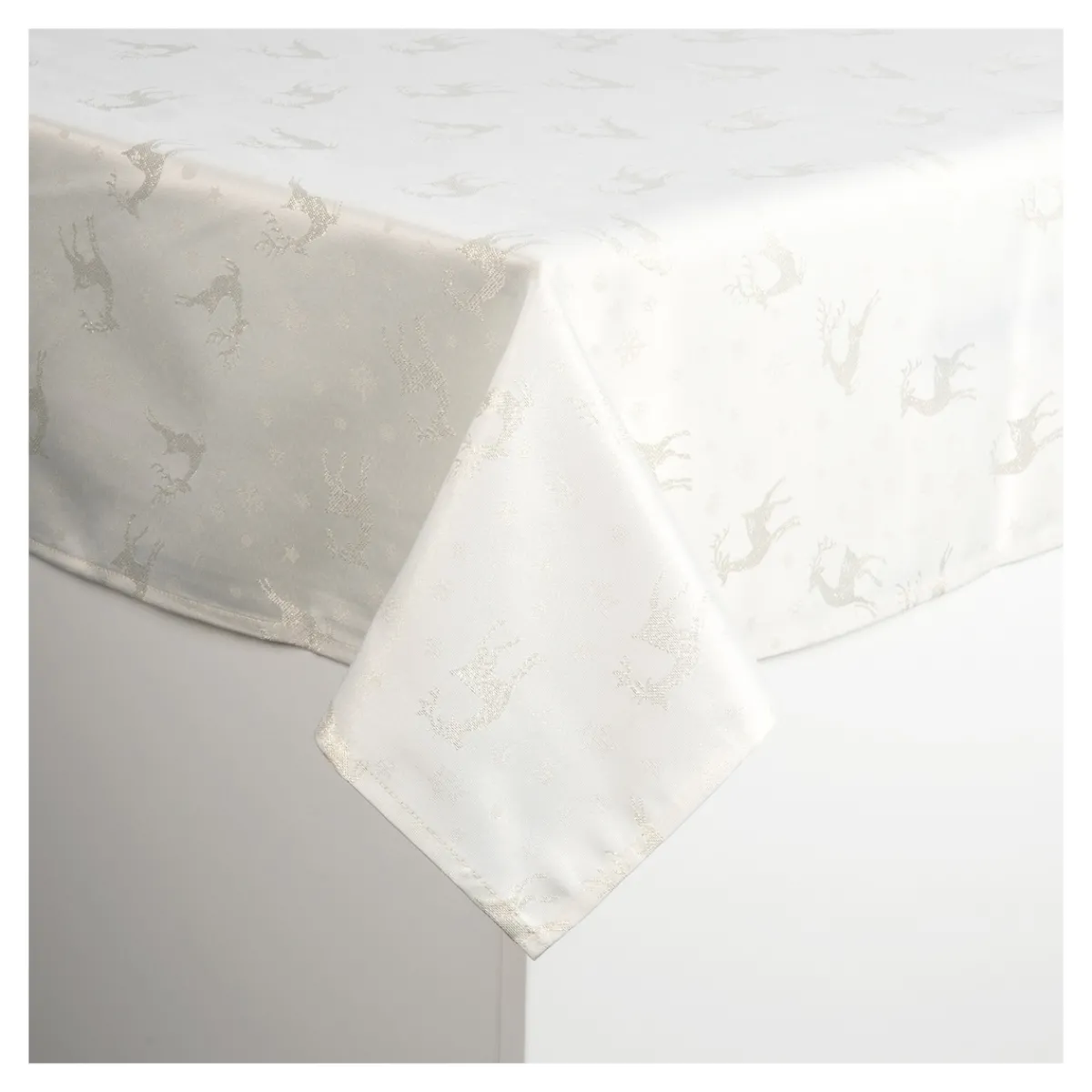 Die Jacquard-Tafeldecke „Rentierzauber“ ist eine wunderschöne, hochwertige Tafeldecke, die Ihre Festtafel in eine magische Winterlandschaft verwandelt. Goldfarbene Rentier-Stickereien auf weiß schimmerndem Stoff setzen edle Akzente und bieten eine stilvolle Grundlage für Ihre Weihnachtsdekoration. Diese langlebige und pflegeleichte Tafeldecke ist die ideale Wahl, um eine festliche und einladende Atmosphäre in Ihrem Zuhause zu schaffen.